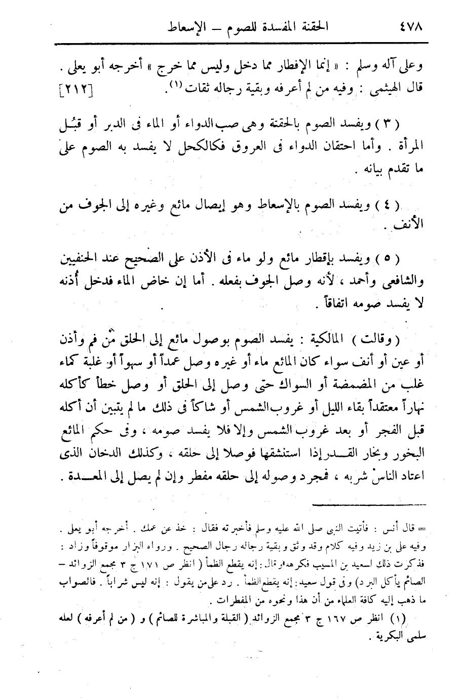(3) ويفسد الصوم بالحقنة وهي صب الدواء أو الماء في الدبر أو قبل المرأة. وأما احتقان الدواء في العروق فكالكحل لا يفسد به الصوم على ما تقدم بيانه.