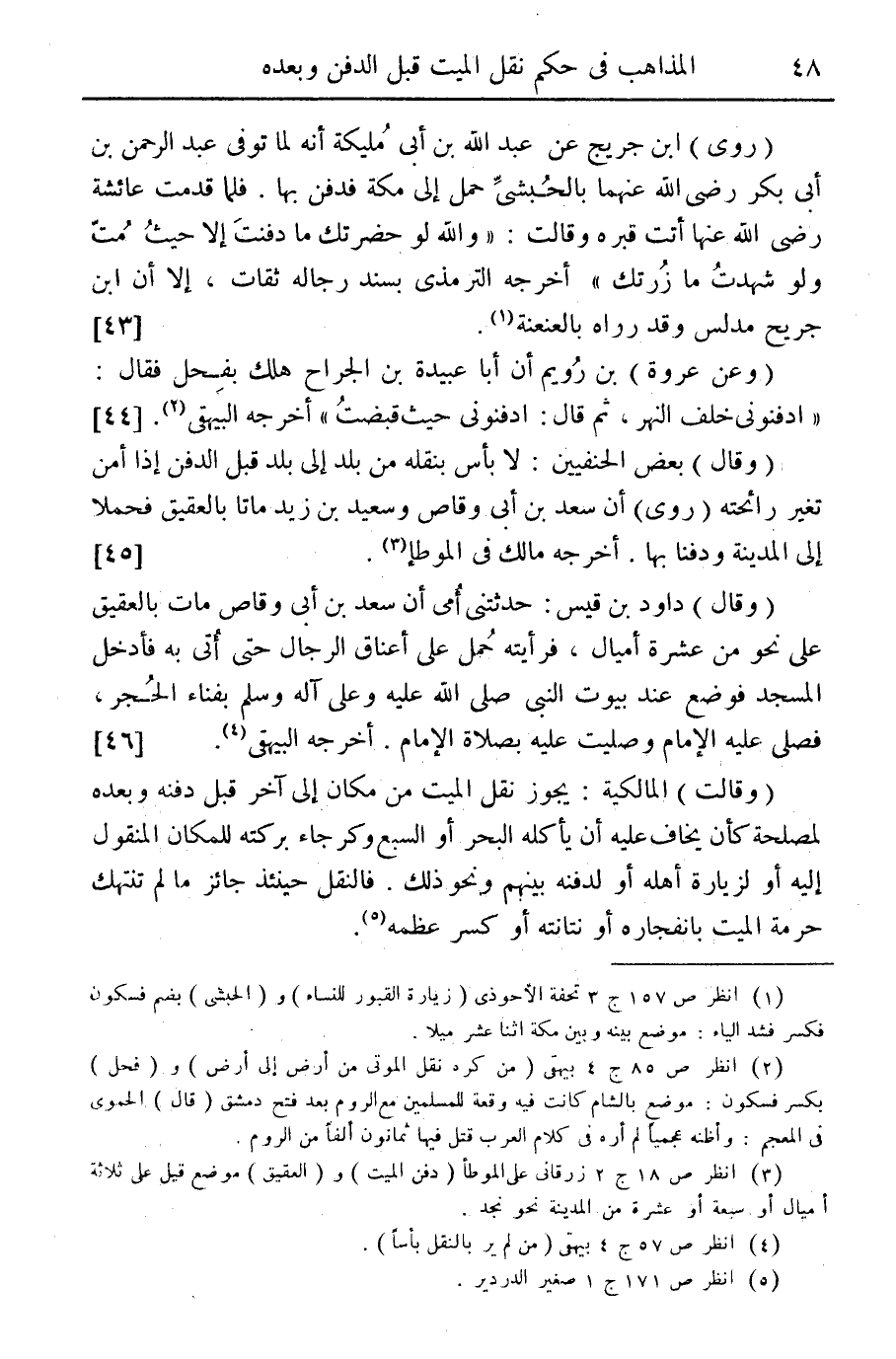 (وقال) بعض الحنفيين: لا بأس بنقله من بلد إلى بلد قبل الدفن إذا أمن تغير رائحته (روى) أن سعد بن أبي وقاص وسعيد بن زيد ماتا بالعقيق فحملا إلى المدينة ودفنا بها. أخرجه مالك في الموطأ (¬3). {45}