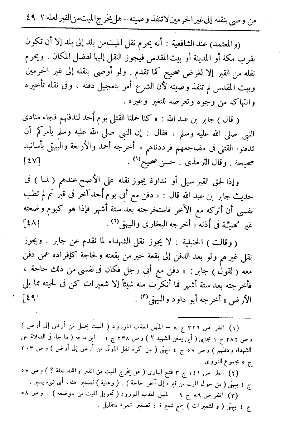 (¬1) أنظر ص 326 ج 8 - المنهل العذب المورود (الميت يحمل من أرض إلى أرض) وص 282 ج 1 مجتبي (أين يدفن الشهيد؟ ) وص 238 ج 1 - ابن ماجه (ما جاء في الصلاة على الشهداء ودفنهم) وص 57 ج 4 بيهقي (من كره نقل الموتى من أرض إلى أرض) وص 303 ج 5 مجموع النووي.