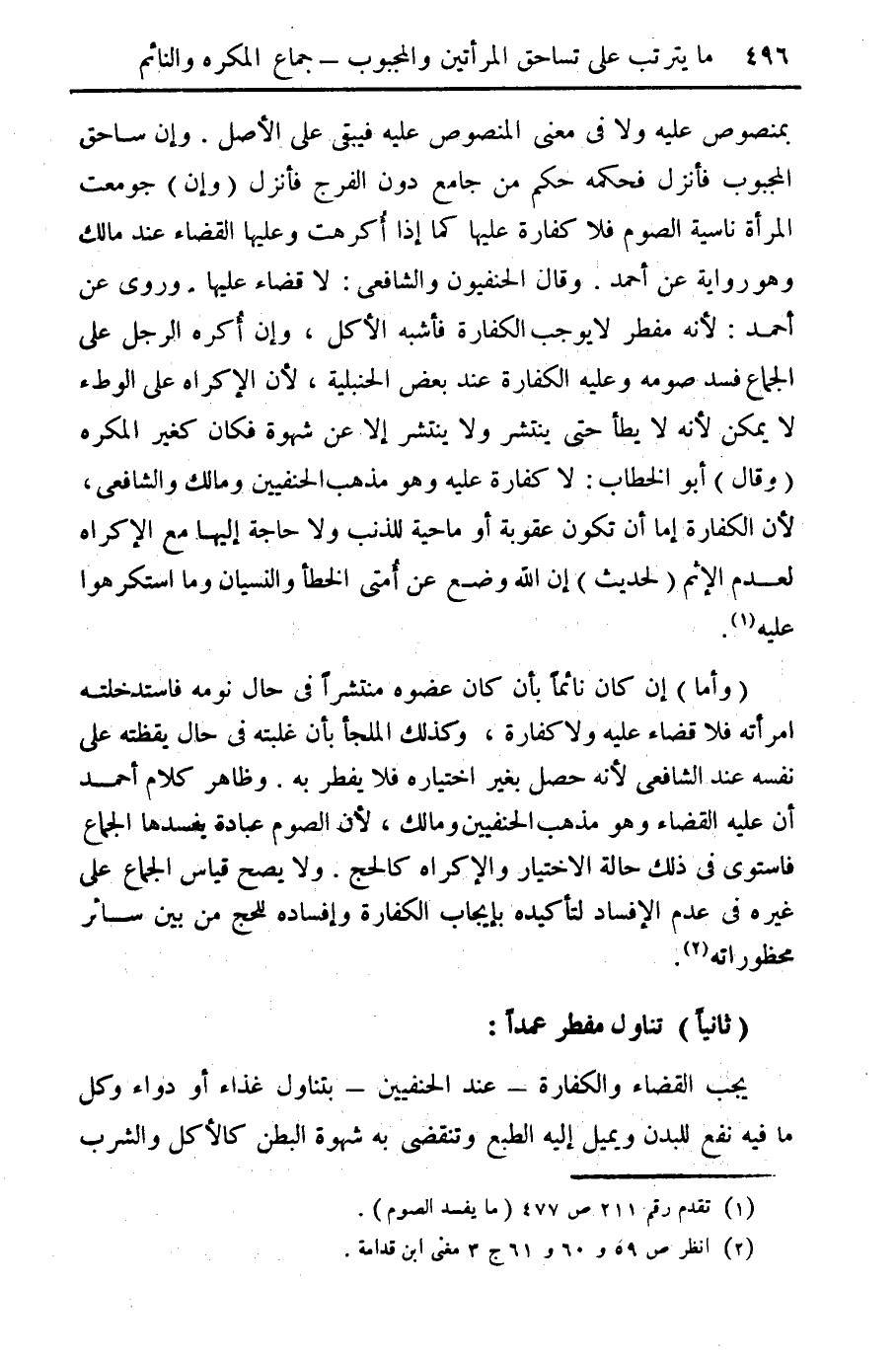(وأما) إن كان نائماً بأن كان عضوه منتشراً في حال نومه فاستدخلته امرأته فلا قضاء عليه ولا كفارة وكذلك الملجأ بأن غلبته في حال يقظته على نفسه عند الشافعي لأنه حصل بغير اختياره فلا يفطر به. وظاهر كلام أحمد أن عليه القضاء وهو مذهب الحنفيين ومالك لأن الصوم عبادة يفسدها الجماع فاستوى في ذلك حالة الاختيار والإكراه كالحج. ولا يصح قياس الجماع على غيره في عدم الإفساد لتأكيد بإيجاب الكفارة وإفساده للحج من بين سائر محظوراته (¬2).