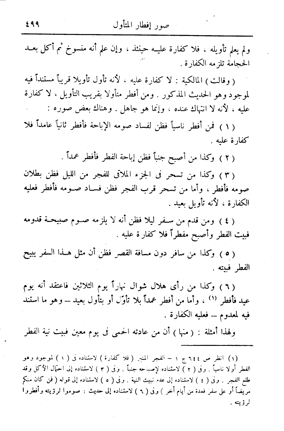 (¬1) انظر ص 644 ج 1 - الفجر المنير (فلا كفارة) لاستناده في (1) لموجود وهو الفطر أولاً ناسياً. وفي (2) لاستناده لإصباحه جنباً. وفي (3) لاستناده إلى احتمال الأكل وقد طلع الفجر. وفي (4) لاستناده إلى عدم تبيت النية وفي (5) لاستناده إلى قوله (فمن كان منكم مريضاً أو على سفرٍ فعدة من أيام أخر) وفي (6) لاستناده إلى حديث: صوموا لرؤيته وأفطروا لرؤيته.
