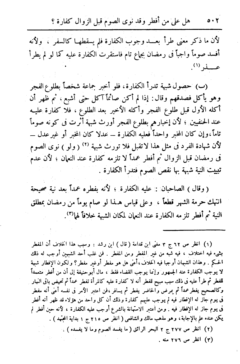(ب) حصول شبهة تدرأ الكفارة فلو أخبر جماعة شخصاً بطلوع الفجر وهو يأكل فصدقهم وقال: إذا لم أكن صائماً آكل حتى أشبع ثم ظهر أن أكله الأول قبل طلوع الفجر وأكله الأخير بعد الطلوع فلا كفارة عليه عند الحنفيين؛ لأن إخبارهم بطلوع الفجر أورث شبهة أثرت في كونه صوماً تاماً وإن كان المخبر واحداً فعليه الكفارة- عدلاً كان المخبر أو غير عدل- لأن شهادة الفرد في مثل هذا لا تقبل فلا تورث شبهة (¬2) (ولو) نوى الصوم في رمضان قبل الزوال ثم أفطر عمداً لا تلزمه كفارة عند النعمان؛ لأن عدم تبييت النية شبهة بها نقص الصوم فتدرأ الكفارة (وقال) الصاحبان: عليه الكفارة؛ لأنه بفطره عمداً بعد نية صحيحة انتهك حرمة الشهر قطعاً وعلى قياس هذا لو صام يوماً من رمضان بمطلق النية ثم أفطر تلزمه الكفارة عند النعمان لمكان الشبهة خلافاً لهما (¬3).