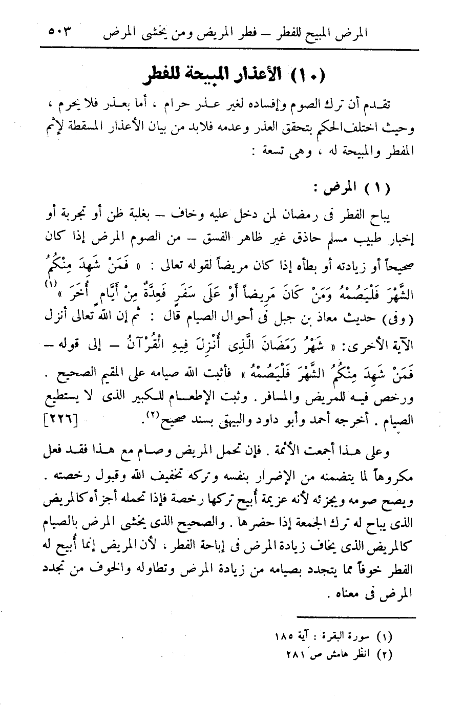 (1) المرض: يباح الفطر في رمضان لمن دخل عليه وخاف- بغلبة ظن أو تجربة أو إخبار طبيب مسلم حاذق غير ظاهر الفسق- من الصوم المرض إذا كان صحيحاً أو زيادته أو بطأه إذا كان مريضاً لقوله تعالى: "فمن شهد منكم الشهر فليصمه ومن كان مريضاً أو على سفر فعدة من أيام أخر (¬1) " (وفي) حديث معاذ بن جبل في أحوال الصيام قال: ثم إن الله تعالى أنزل الآية الأخرى "شهر رمضان الذي أنزل فيه القرآن- إلى قوله- فمن شهد منكم الشهر فليصمه" فأثبت الله صيامه على المقيم الصحيح. ورخص فيه للمريض والمسافر. وثبت الإطعام الكبير الذي لا يستطيع الصيام، أخرجه احمد وأبو داود والبيهقي بسند صحيح (¬2). {226}