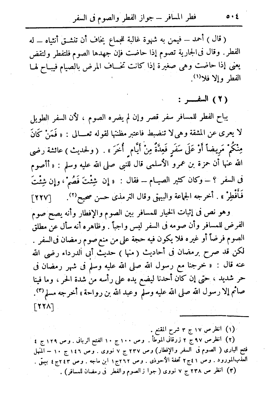 (2) السفر: يباح الفطر للمسافر سفر قصر وإن لم يضره الصوم، لأن السفر الطويل لا يعري عن المشقة وهي لا تنضبط فاعتبر مظنتها لقوله تعالى: "فمن كان منكم مريضاً أو على سفر فعدة من أيام أخر". (ولحديث) عائشة رضي الله عنها أن حمزة بن عمرو الأسلمي قال للنبي صلى الله عليه وسلم: "أأصوم في السفر؟ - وكان كثير الصيام- فقال: "إن شئت فصم وإن شئت فأفطر" أخرجه الجماعة والبيهقي وقال الترمذي حسن صحيح (¬2) {227}