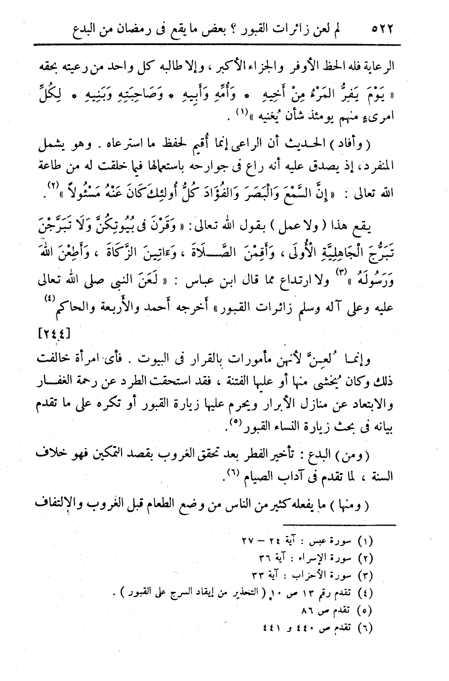 يقع هذا (ولا عمل) بقول الله تعالى: "وقرن في بيوتكن ولا تبرجن تبرج الجاهلية الأولى وأقمن الصلاة وءاتين الزكاة وأطعن الله ورسوله (¬3) " ولا ارتداع مما قال ابن عباس: "لعن النبي صلى الله تعالى عليه وعلى آله وسلم زائرات القبور" أخرجه أحمد والأربعة والحاكم (¬4). {244}