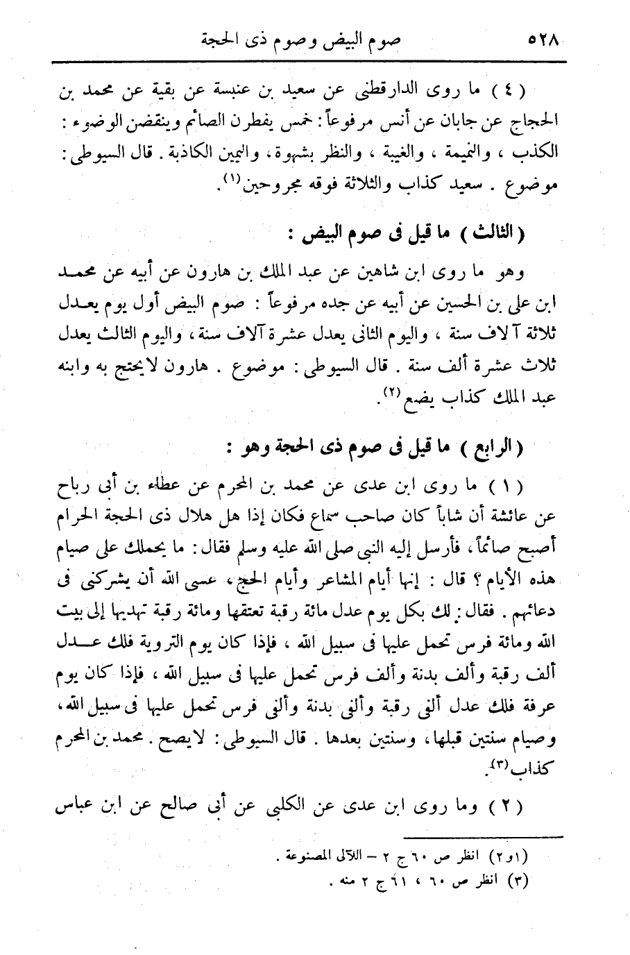 (والثالث) ما قيل في صوم البيض- وهو ما روي ابن شاهين عن عبد الملك ابن هرون عن أبيه عن محمد بن علي بن الحسين عن أبيه عن جده مرفوعاً: صوم البيض أول يوم يعدل ثلاثة آلاف سنة. واليوم الثاني يعدل عشرة آلاف سنة واليوم الثالث يعدل ثلاث عشرة ألف سنة. قال السيوطي موضوع. هرون لا يحتج به وابنه عبد الملك كذاب يضع (¬2).