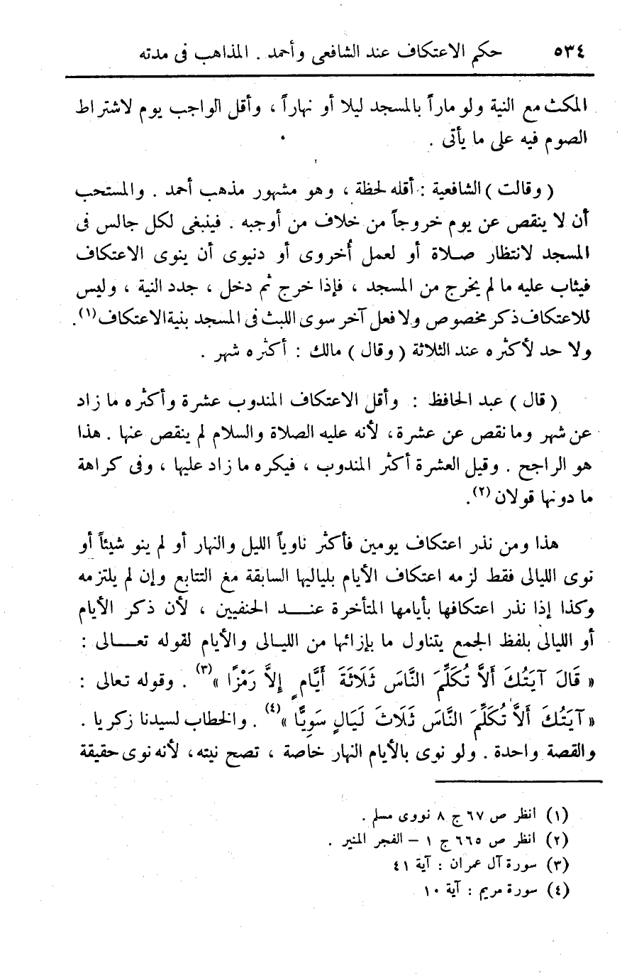المكث مع النية ولو ماراً بالمسجد ليلاً أو نهاراً وأقل الواجب يوم لاشتراط الصوم فيه على ما يأتي (وقالت) الشافعية: أقله لحظة وهو مشهور مذهب أحمد. والمستحب أن لا ينقص عن يوم خروجاً من خلاف من أوجبه. فينبغي لكل جالس في المسجد لانتظار أو لعمل أخروي أو دنيوي أن ينوي الاعتكاف فيثاب عليه ما لم يخرج من المسجد فإذا خرج ثم دخل جدد النية وليس للاعتكاف ذكر مخصوص ولا فعل آخر سوى اللبث في المسجد بنية الاعتكاف (¬1) ولا حدّ لأكثره عند الثلاثة (وقال) مالك: أكثره شهر (قال) عبد الحافظ: وأقل الاعتكاف المندوب عشرة وأكثره ما زاد عن شهر وما نقص عن عشرة لأنه عليه الصلاة والسلام لم ينقص عنها هذا هو الراجح وقيل العشرة أكثر المندوب فيكره ما زاد عليها وفي كراهة ما دونها قولان (¬2). هذا ومن نذر اعتكاف يومين فأكثر ناوياً الليل والنهار أو لم ينو شيئاً أو نوى الليالي فقط لزمه اعتكاف الأيام بلياليها السابقة مع التتابع وإن لم يلتزمه وكذا إذا نذر اعتكافها بأيامها المتأخرة عند الحنفيين لأن ذكر الأيام أو الليالي بلفظ الجمع يتناول ما بإزائها من الليالي والأيام لقوله تعالى: "قال آيتك ألا تكلم الناس ثلاثة أيام إلا رمزاً" (¬3) وقوله: "ءايتك ألا تكلم الناس ثلاث ليال سويا" (¬4) والخطاب لسيدنا زكريا. والقصة واحدة ولو نوى بالأيام النهار خاصة، تصح نيته لأنه نوى حقيقة