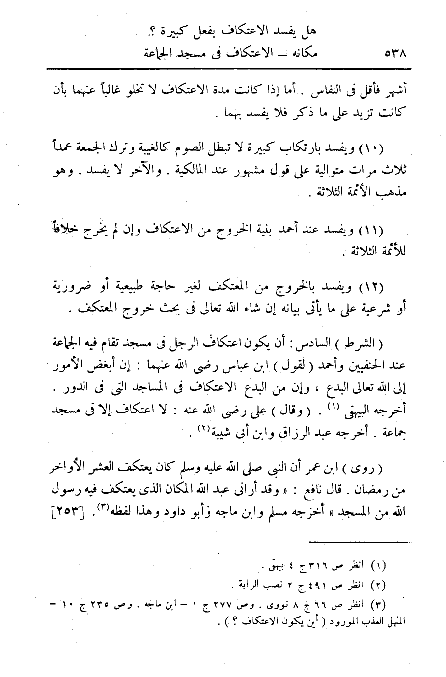 (¬3) انظر ص 66 ج 8 نووي. وص 277 ج 1 - ابن ماجه. وص 235 ج 10 المنهل العذب المورود (أين يكون الاعتكاف؟ ).