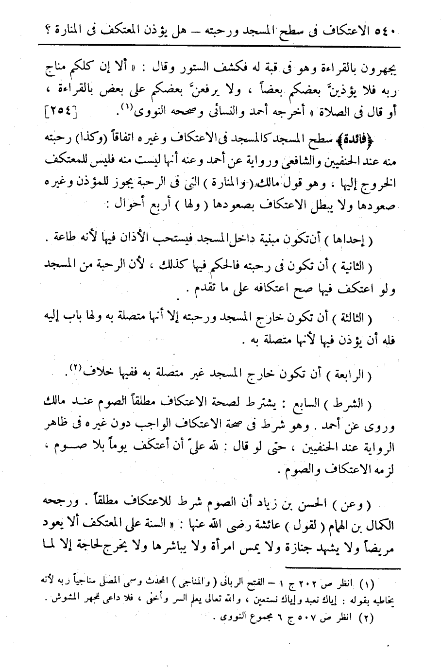 (فائدة) سطح المسجد كالمسجد في الاعتكاف وغيره اتفاقاً (وكذا) رحبته منه عند الحنفيين والشافعي ورواية عن أحمد وعنه أنها ليست منه فليس للمعتكف الخروج إليها، وهو قول مالك (والمنارة) التي في الرحبة يجوز للمؤذن وغيره صعودها ولا يبطل الاعتكاف بصعودها (ولها) أربع أحوال (إحداها) أن تكون مبنية داخل المسجد فيستحب الأذان فيها لأنه طاعة (الثانية) أن تكون في رحبته فالحكم فيها كذلك، لأن الرحبة من المسجد ولو اعتكف فيها صح اعتكافه على ما تقدم (الثالثة) أن تكون خارج المسجد ورحبته إلا أنها متصلة به ولها باب إليه فله أن يؤذن فيها لأنها متصلة به (الرابعة) أن تكون خارج المسجد غير متصلة به ففيها خلاف (¬2). (السابع) يشترط لصحة الاعتكاف مطلقاً الصوم عند مالك وروي عن أحمد. وهو شرط في صحة على أن اعتكف الواجب دون غيره في ظاهر الرواية عند الحنفيين حتى لو قال الله عليّ أن اعتكف يوماً بلا صوم لزمه الاعتكاف والصوم (وعن) الحسن بن زياد أن الصوم شرط للاعتكاف مطلقاً. ورجحه الكمال بن الهمام (لقول) عائشة رضي الله عنها: "السنة على المعتكف ألا يعود مريضاً ولا يشهد جنازة ولا يمس امرأة ولا يباشرها ولا يخرج لحاجة إلا لما