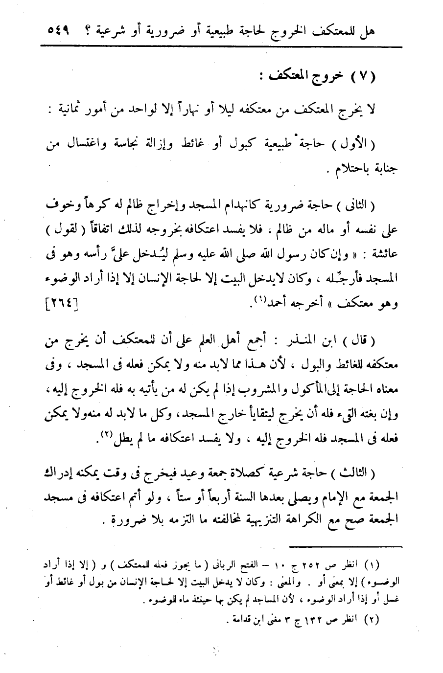 (7) خروج المعتكف: لا يخرج المعتكف من معتكفه ليلاً أو نهاراً إلا لو أحد من أمور ثمانية: (الأول) حاجة طبيعية كبول أو غائط وإزالة نجاسة واغتسال من جنابة باحتلام (الثاني) حاجة ضرورية كانهدام المسجد وإخراج ظالم له كرهاً وخوف على نفسه أو ماله من ظالم فلا يفسد اعتكافه بخروجه لذلك اتفاقاً (لقول) عائشة: "وإن كان رسول الله صلى الله عليه وسلم ليدخل عليّ رأسه وهو في المسجد فأرجله، وكان لا يدخل البيت إلا لحاجة الإنسان إلا إذا أراد الوضوء وهو معتكف" أخرجه أحمد (¬1) {264}