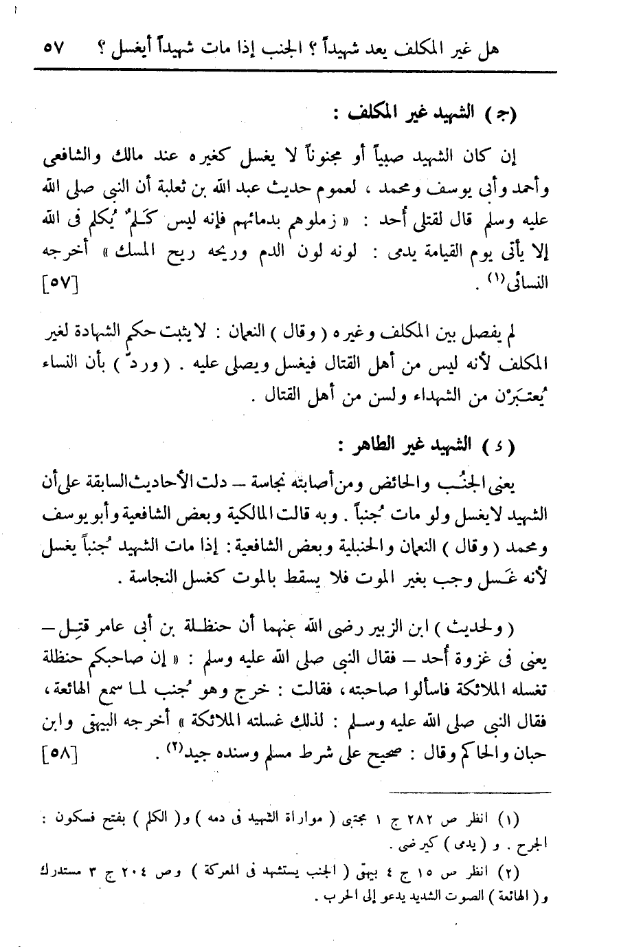 يعني الجنب والحائض ومن أصابته نجاسة- دلت الأحاديث السابقة على أن الشهيد لا يغسل ولو مات جنبا. وبه قالت المالكية وبعض الشافعية وأبو يوسف ومحمد (وقال) النعمان والحنبلية وبعض الشافعية: إذا مات الشهيد جنبا يغسل لأنه غسل وجب بغير الموت فلا يسقط بالموت كغسل النجاسة.