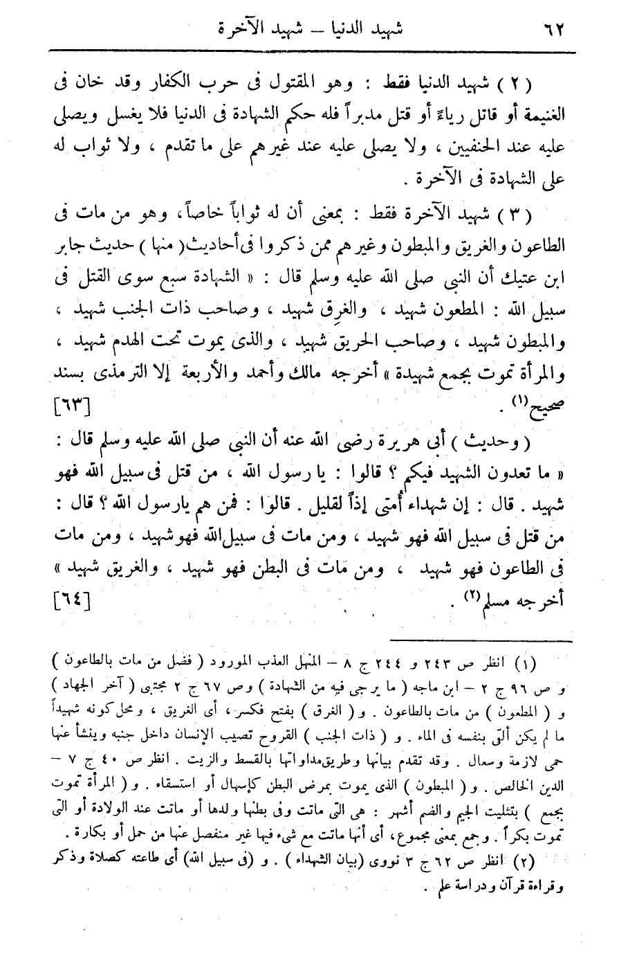 (3) شهيد الآخرة فقط: بمعنى أن له ثوابا خاصا، وهو من مات في الطاعون والغريق والمبطون وغيرهم ممن ذكروا في أحاديث (منها) حديث جابر ابن عتيك أن النبي صلى الله عليه وسلم قال: " الشهادة سبع سوى القتل في سبيل الله: المطعون شهيد، والغرق شهيد، وصاحب ذات الجنب شهيد، والمبطون شهيد، وصاحب الحريق شهيد، والذي يموت تحت الهدم شهيد، والمرأة تموت بجميع شهيدة" أخرجه مالك وأحمد وأربعة إلا الترمذي بسند صحيح (¬1). {63}
