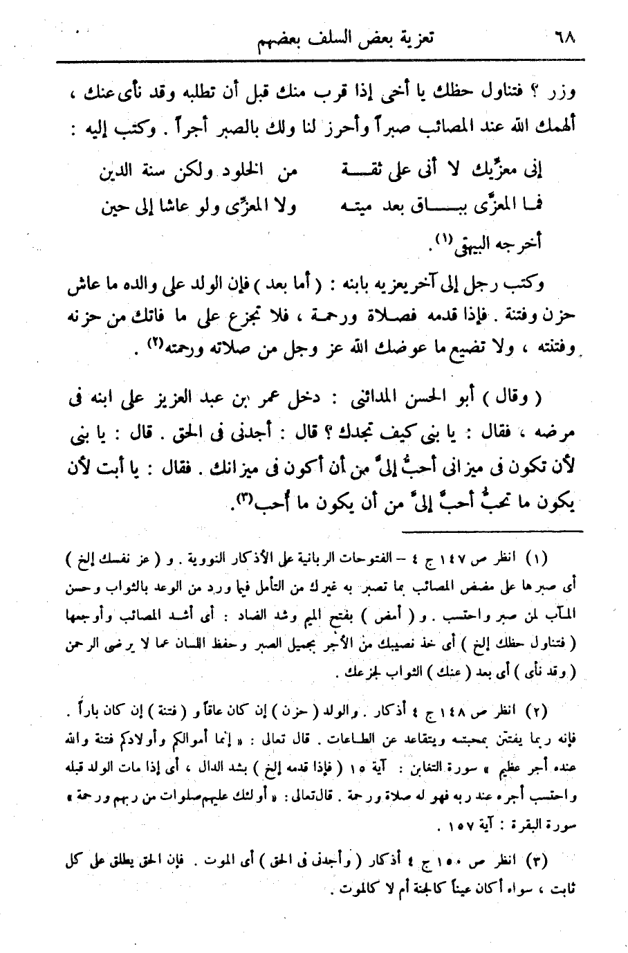 (¬1) انظر ص 147 ج 4 - الفتوحات الربانية على الأذكار النووية. و (عز نفسك إلخ) أي صبرها على مضض المصائب بما تصبر به غيرك من التأمل فيما ورد من الوعد بالثواب وحسن المآب لمن صبر واحتسب. و (أمض) بفتح الميم وشد الضاد: أي أشد المصائب واوجعها (فتناول حظك إلخ) أي خذ نصيبك من الأجر بجميل الصبر وحفظ اللسان عما لا يرضى الرحمن (وقد نأى) أي بعد (عنك) الثواب لجزعك.
