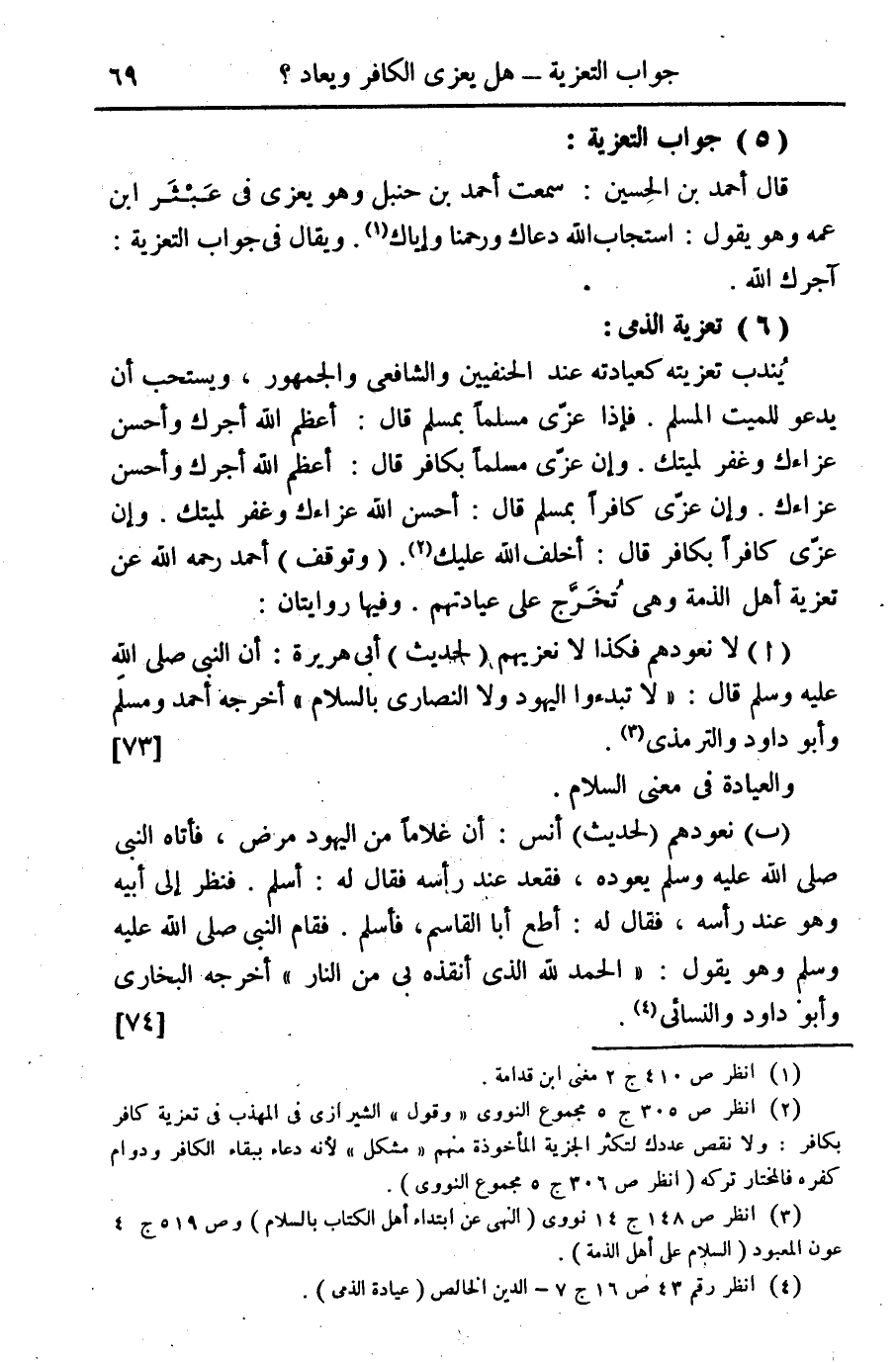 (أ) لا نعودهم فكذا لا نعزيهم (لحديث) أبي هريرة: أن النبي صلى الله عليه وسلم قال: "لا تبدءوا اليهود ولا النصارى بالسم" أخرجه أحمد ومسلم وأبو داود والترمذي (¬3). {73}