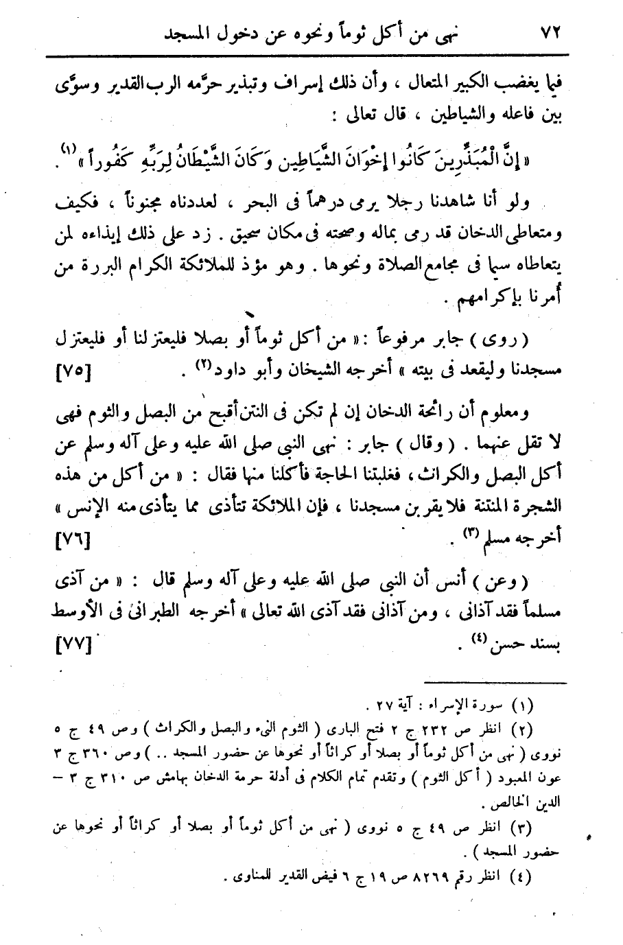 (¬2) انظر ص 232 ج 2 فتح الباري (الثوم النئ والبصل والكراث) وص 49 ج 5 نووي (نهى من أكل ثوما أو بصلا أو كراثا أو نحوها عن حضور المسجد .. ) وص 360 ج 3 عون المعبود (أكل الثوم) وتقدم تمام الكلام في أدلة حرمة الدخان بهامش ص 310 ج 3 - الدين الخالص.