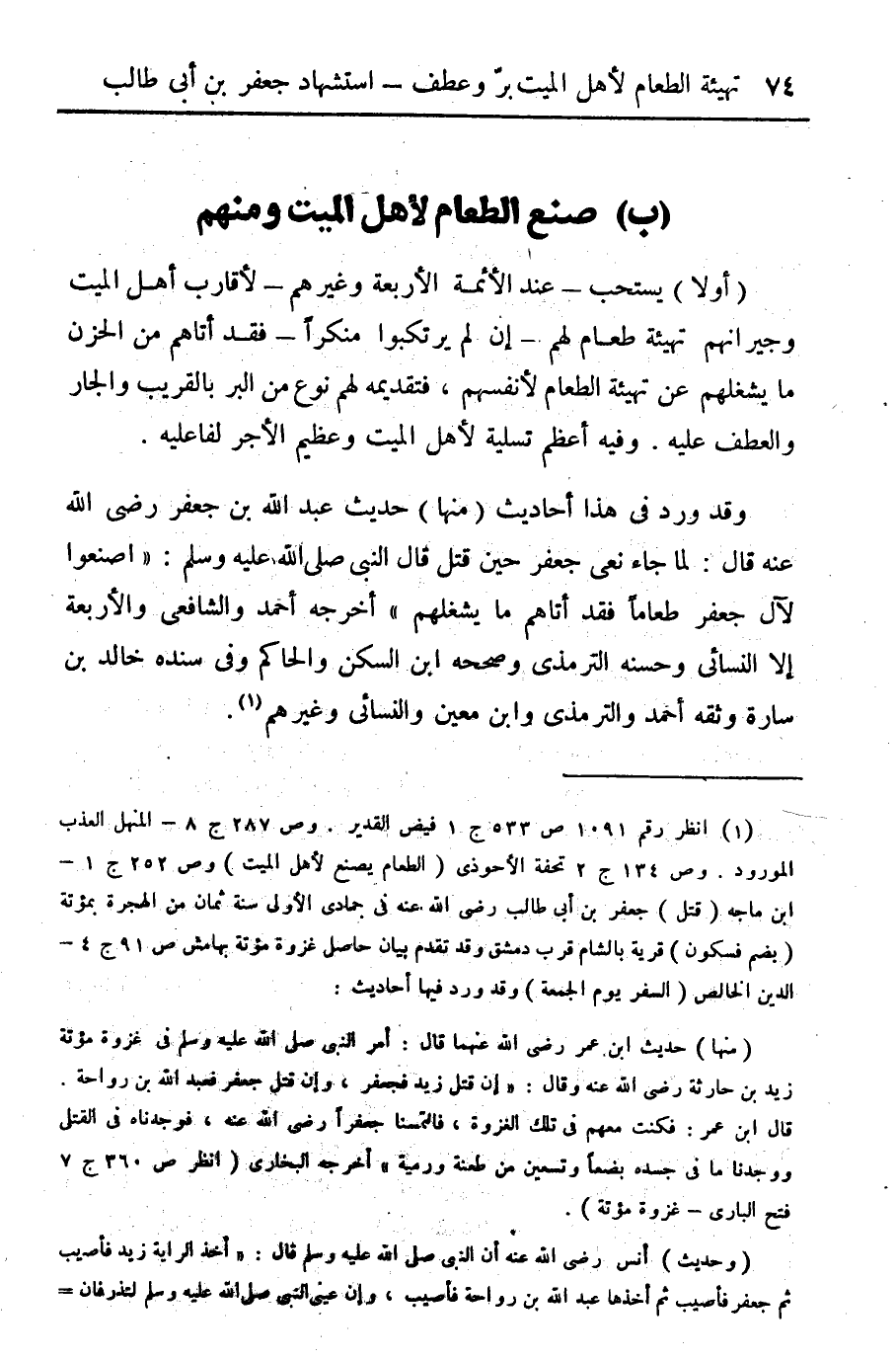 (¬1) انظر رقم 1091 ص 533 ج 1 فيض القدير. وص 287 ج 8 - المنهل العذب المورود. وص 134 ج 2 تحفة الأحوذي (الطعام يصنع لأهل الميت) وص 252 ج 1 - ابن ماجه (قتل) جعفر بن أبي طالب رضي الله عنه في جمادى الأول سنة ثمان من الهجرة بمؤتة (يضم فسكون) قرية بالشام قرب دمشق وقد تقدم بيان حاصل غزوة مؤتة بهامش ص 91 ج 4 - الدين الخالص (السفر يوم الجمعة) وقد ورد فيها أحاديث: