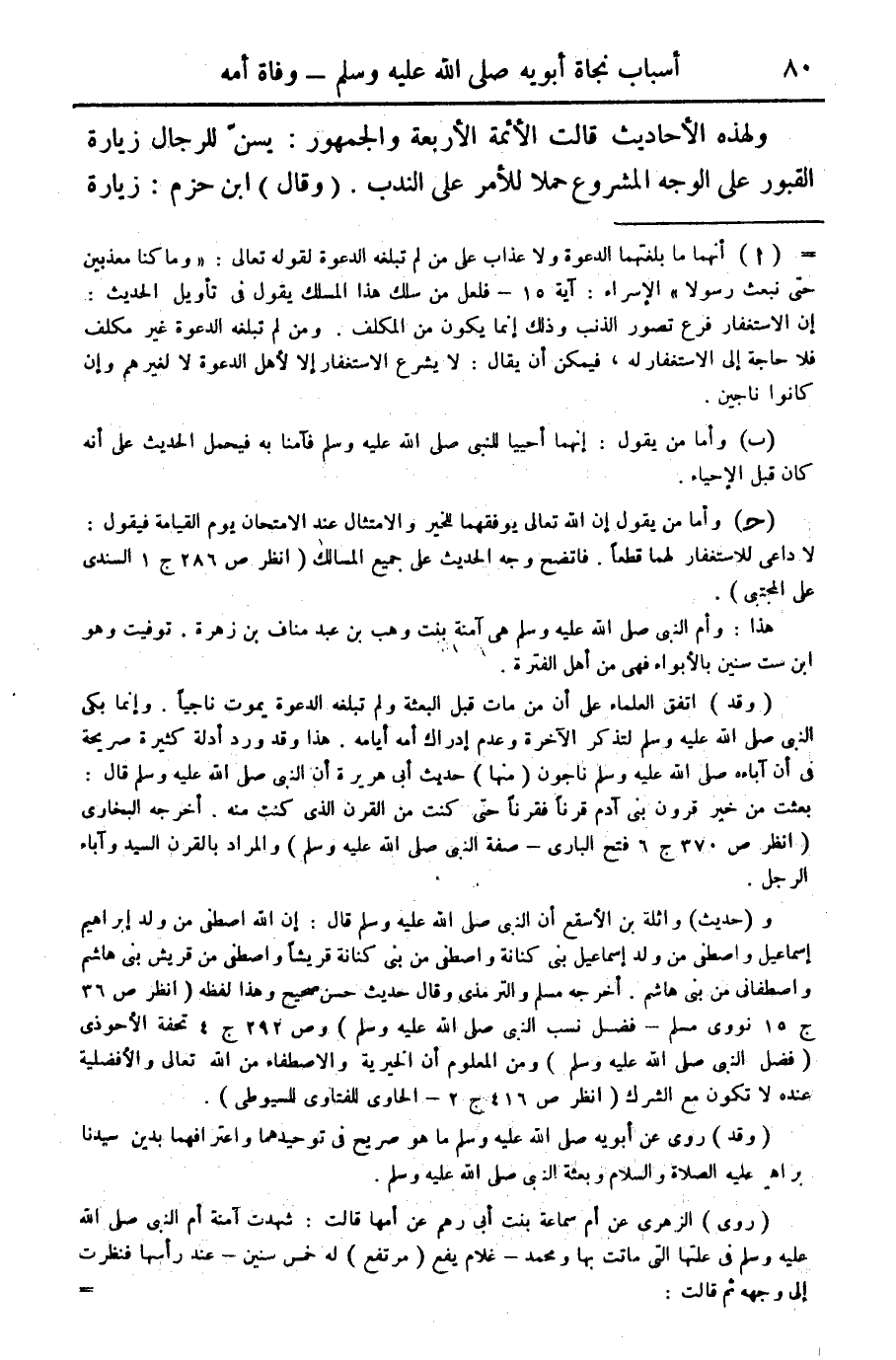 (وقد) اتفق العلماء على أن من مات قبل البعثة ولم تبلغه الدعوة يموت ناجيا. وإنما بكى النبي صلى الله عليه وسلم لتذكر الآخرة وعدم إدراك أمه أيامه. هذا وقد ورد أدلة كثيرة صريحة في أن آباءه صلى الله عليه وسلم ناجحون (منها) حديث أبي هريرة أن النبي صلى الله عليه وسلم قال: بعثت من خير قرون بني آدم قرنا فقرنا حتى كنت من القرن الذي كنت منه. أخرجه البخاري (أنظر ص 370 ج 6 فتح الباري- صفة النبي صلى الله عليه وسلم) والمراد بالقرن السيد وآباء الرجل.