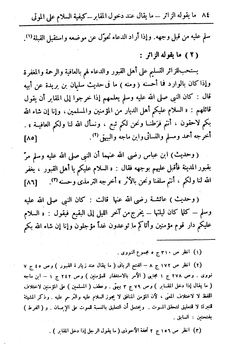 يستحب للزائر التسليم على أهل القبور والدعاء لهم بالعافية والرحمة والمغفرة وإذا كان بالوارد فما أحسنه (ومنه) ما في حديث سليمان بن بريدة عن أبيه قال: كان النبي صلى الله عليه وسلم يعلمهم إذا خرجوا إلى المقابر أن يقول قائلهم: "السلام عليكم أهل الديار من المؤمنين والمسلمين، وإنا إن شاء الله بكم لاحقون، أنتم فرطنا ونحن لك تبع، ونسأل الله لنا ولكم العافية". أخرجه أحمد ومسلم والنسائي وابن ماجه والبيهقي (¬2). {85}