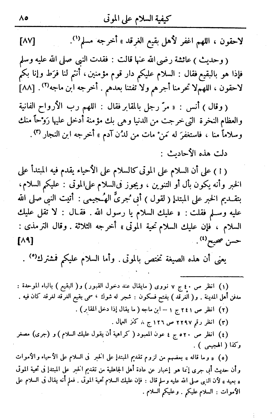 (وحديث) عائشة رضي الله عنها قالت: فقدت النبي صلى الله عليه وسلم فإذا هو بالبقيع فقال: السلام عليكم دار قوم مؤمنين، أنتم لنا فرط وإنا بكم لاحقون، اللهم لا تحرمنا أجرهم ولا تفتنا بعدهم. أخرجه ابن ماجه (¬2). {88}