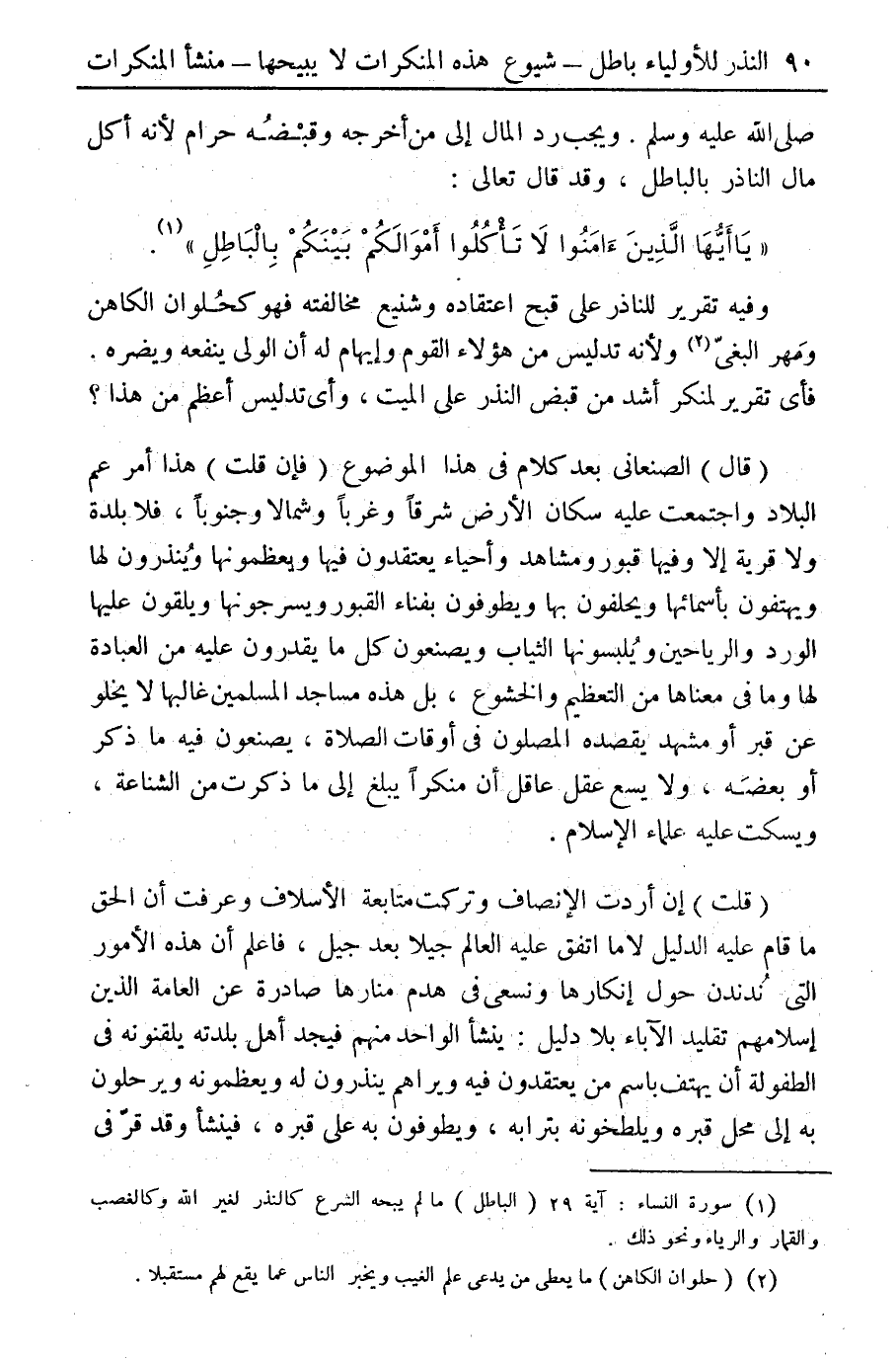 ... (قلت) إن أردت الإنصاف وتركت متابعة الأسلاف وعرفت أن الحق ما قام عليه الدليل لا ما اتفق عليه العالم جيلا بعد جيل، فاعلم أن هذه الأمور التي ندندن حولها إنكارها ونسعى في هدم منارها صادرة عن العامة الذين إسلامهم تقليد الآباء بلا دليل: ينشأ الواحد منهم فيجد أهل بلدته يلقنونه في الطفولة أن يهتف باسم من يعتقدون فيه ويراهم ينذرون له ويعظمونه ويرحلون به إلى محل قبره ويلطخونه بترابه، ويطوفون به على قبره، فينشأ وقد قر في