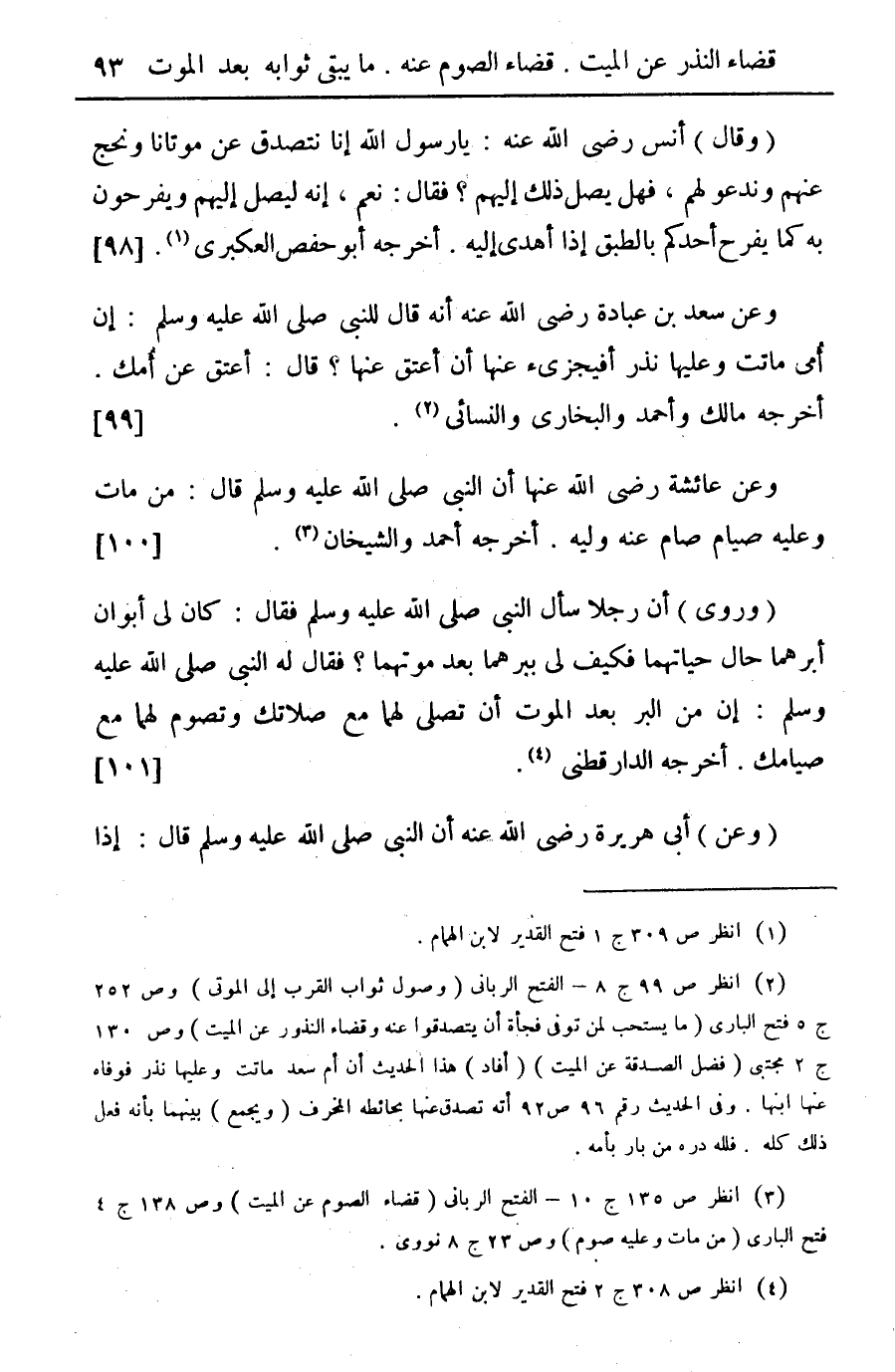 (¬2) انظر ص 99 ج 8 - الفتح الرباني (وصول ثواب القرب إلى الموتى) وص 252 ج 5 فتح الباري (ما يستحب لمن توفى فجأة أن يتصدقوا عنه وقضاء النذور عن الميت) وص 130 ج 2 مجتبي (فضل الصدقة عن الميت) (أفاد) هذا الحديث أن أم سعد ماتت وعليها نذر فوفاه عنها ابنها. وفي الحديث رقم 96 ص 92 أته تصدق عنها بحائطه المخرف (ويجمع) بينهما بأنه فعل ذلك كله. فلله دره من بار بأمه.