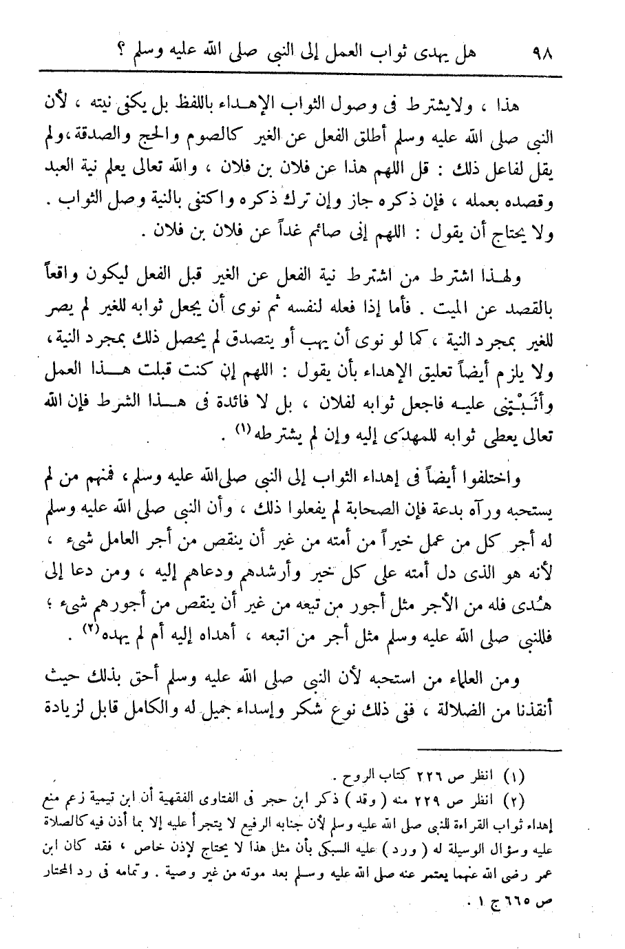 (¬2) انظر ص 22*9 منه (وقد) ذكر ابن حجر في الفتاوى الفقهية أن ابن تيمية زعم منع إهداء ثواب القراءة للنبي صلى الله عليه وسلم لأن جنابه الرفيع لا يتجرأ عليه إلا بما أذن فيه كالصلاة عليه وسؤال الوسيلة له (ورد) عليه السبكي بأن مثل هذا لا يحتاج لإذن خاص، فقد كان ابن عمر رضي الله عنهما يعتمر عنه صلى الله عليه وسلم بعد موته من غير وصية. وتمامه في رد المحتار ص 665 ج 1.