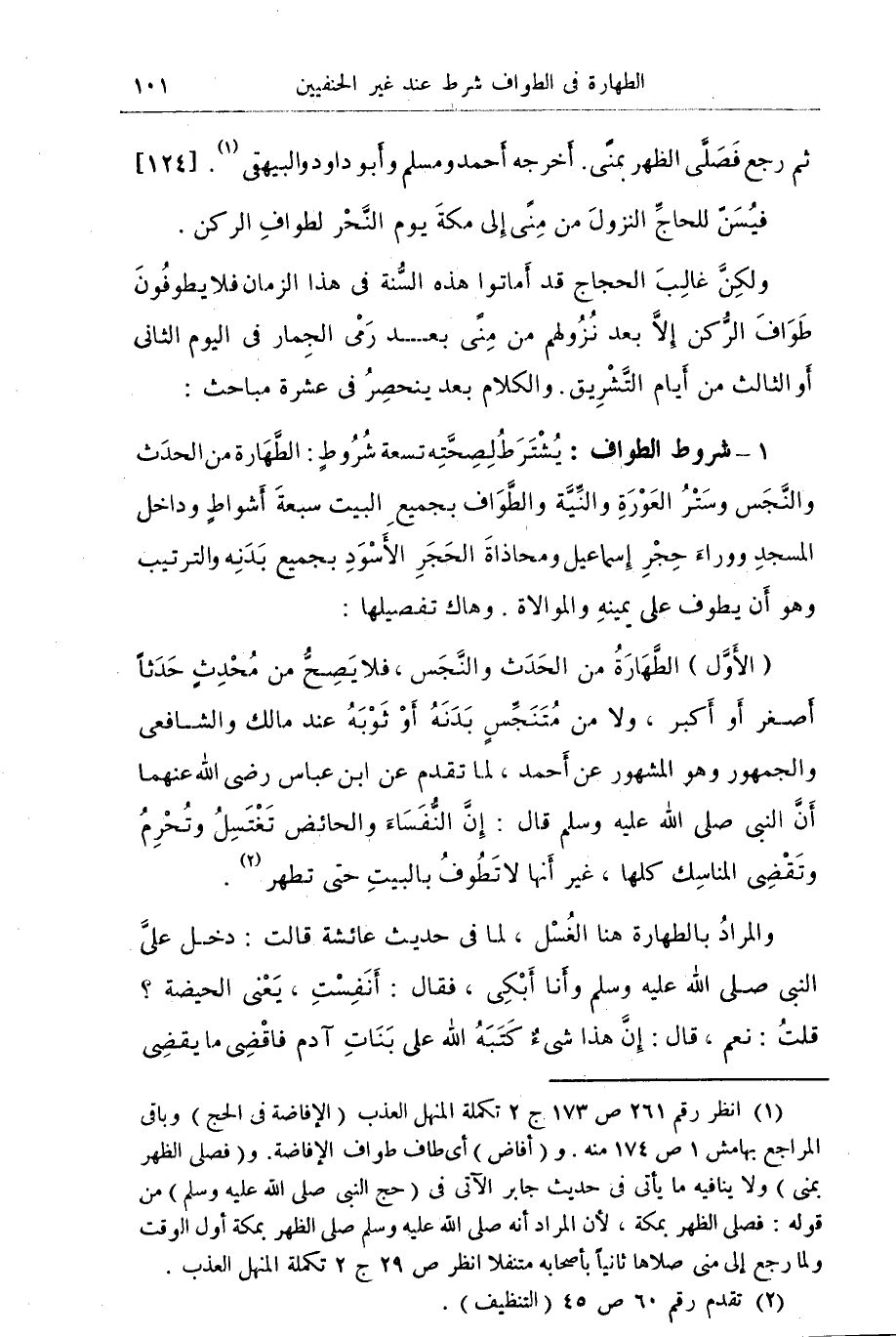 (الأول) الطهارة من الحدث والنجس فلا يصح من محدث حدثا أصغر أو أكبر , ولا من متنجس بدنه أو ثوبه عند مالك والشافعي والجمهور وهو المشهور عن أحمد , لما تقدم عن ابن عباس رضي الله عنهما أن النبي صلى الله عليه وسلم قال: أن النفساء والحائض تغتسل وتحرم وتقضي المناسك كلها , غير أنها لا تطوف بالبيت حتى تطهر (¬2).