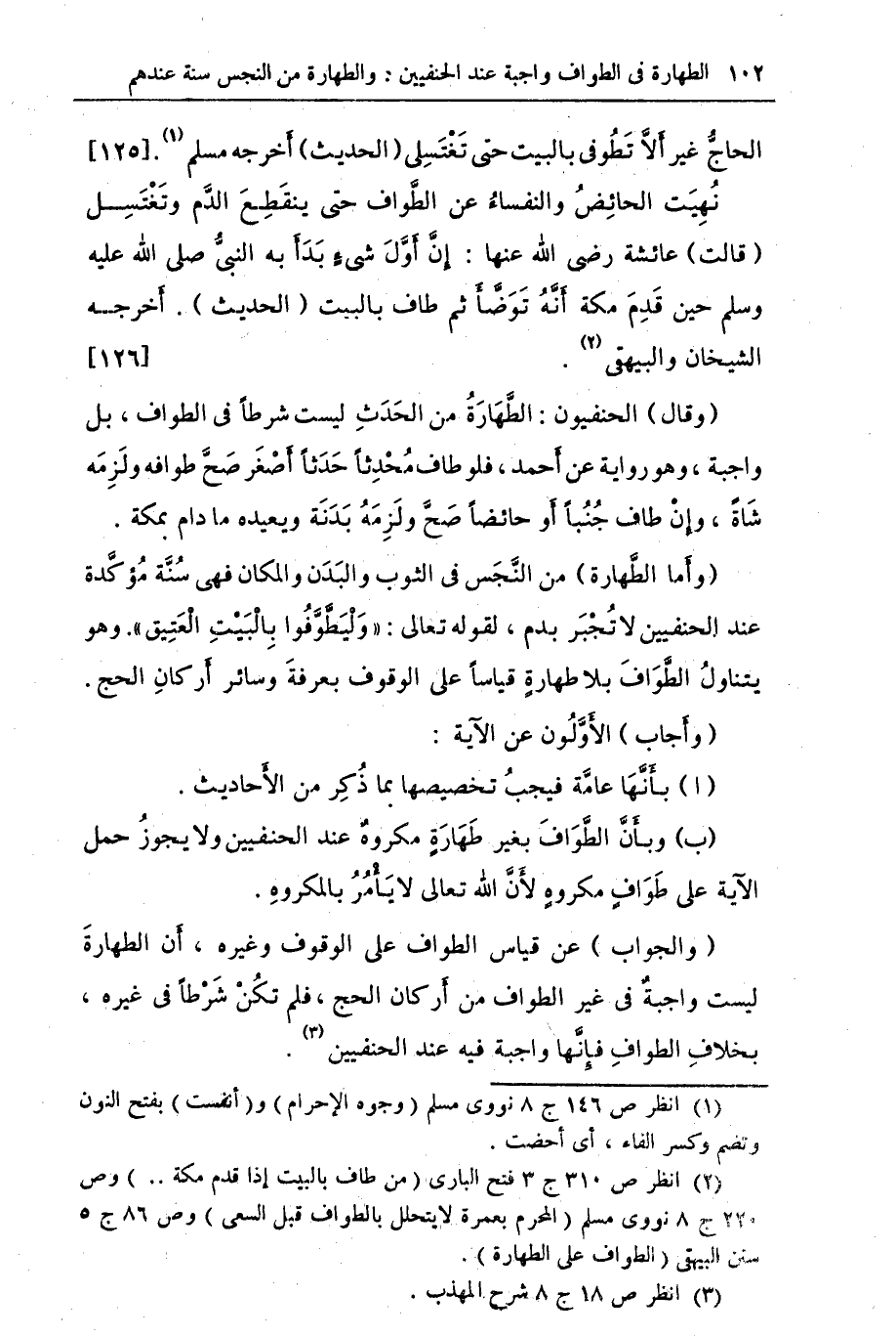 (ب) وبأن الطواف بغير طهارة مكروه عند الحنفيين ولا يجوز حمل الآية على طواف مكروه لأن الله تعالى لا يأمر بالمكروه (والجواب) عن قياس الطواف على الوقوف وغيره , أن الطهارة ليست واجبة في غير الطواف من أركان الحج فلم تكن شرطاً في غيره. بخلاف الطواف فأنها واجبة فيه عند الحنفيين (¬3).
