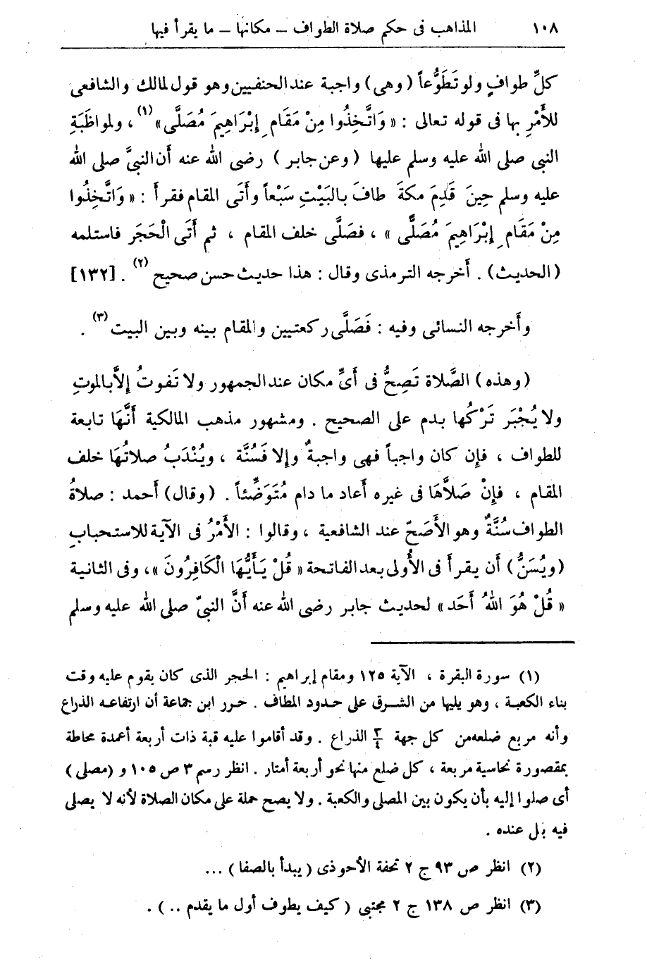 (¬1) البقرة 125. ومقام إبراهيم: الحجر الذي كان يقوم عليه وقت بناء الكعبة وهو يليها من الشرق على حدود المطاف. حرر ابن جماعة أ، ارتفاعه 7/ 8 الذراع وأنه مربع ضلعه من كل جهة ¾ الذراع. وقد أقاموا عليه قبة ذات أربعة أعمدة محاطة بمقصورة نحاسية مربعة , كل ضلع منها نحو أربعة أمتار. أنظر رسم 3 ص 105 و (مصلى) أي صلوا إليه بأن يكون بين المصلي والكعبة. ولا يصح حمله على مكان الصلاة لأنه لا يصلى فيه بل عنده.
