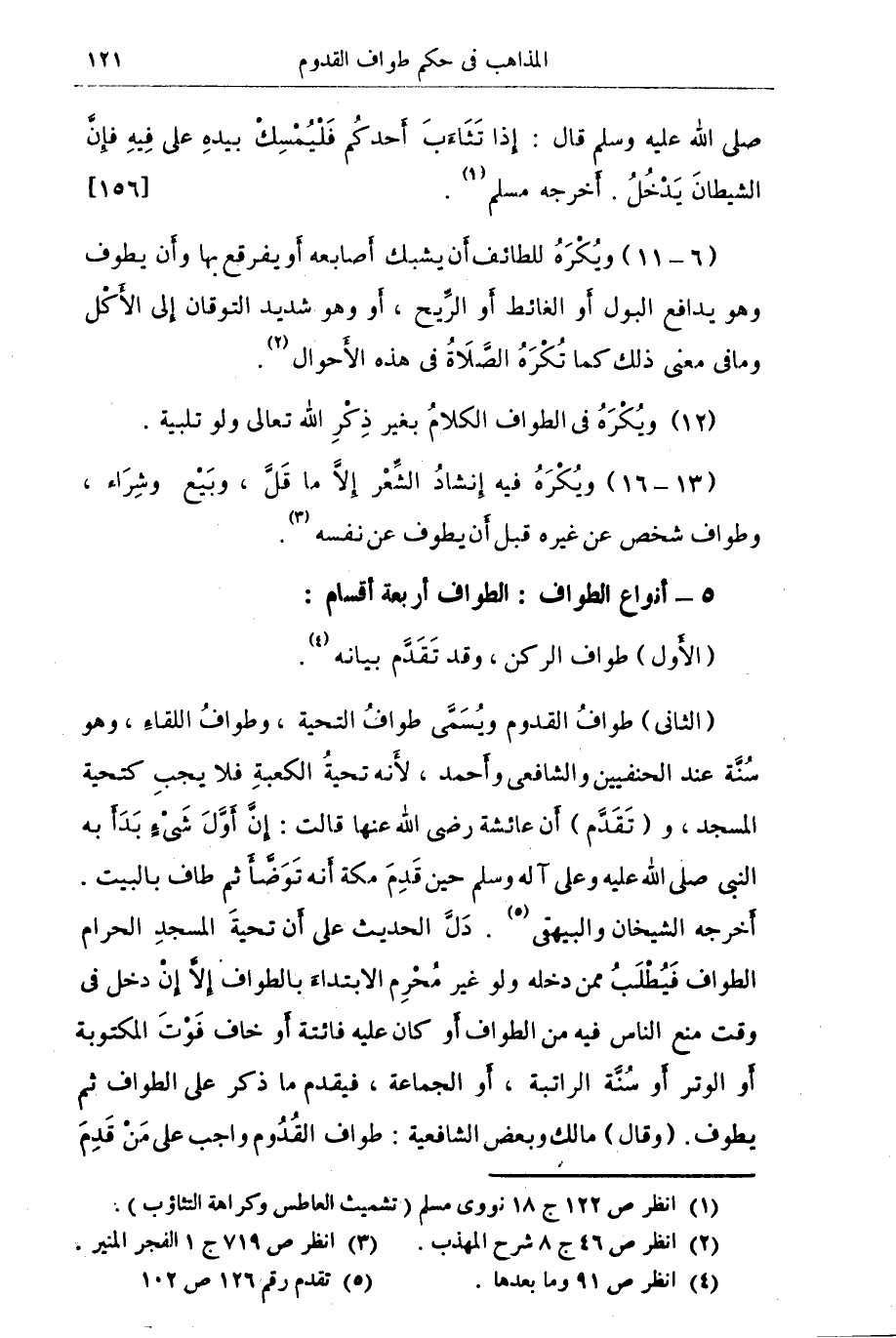 (6 - 11) ويكره للطائف أن يشبك أصابعه أو يفرقع بها وأن يطوف وهو يدافع البول أو الغائط أو الريح , أو وهو شديد التوقان إلى الأكل وما في معنى ذلك كما تكره الصلاة في هذه الأحوال (¬2).