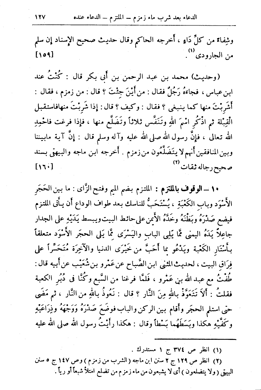 (¬2) ص 129 ج 2 سنن ابن ماجه (الشرب من زمزم) وص 147 ج 5 سنن البيهقي (ولا يتضلعون) أى يشبعون من ماء زمزم من تضلع امتلأ شبعا أو ريا.