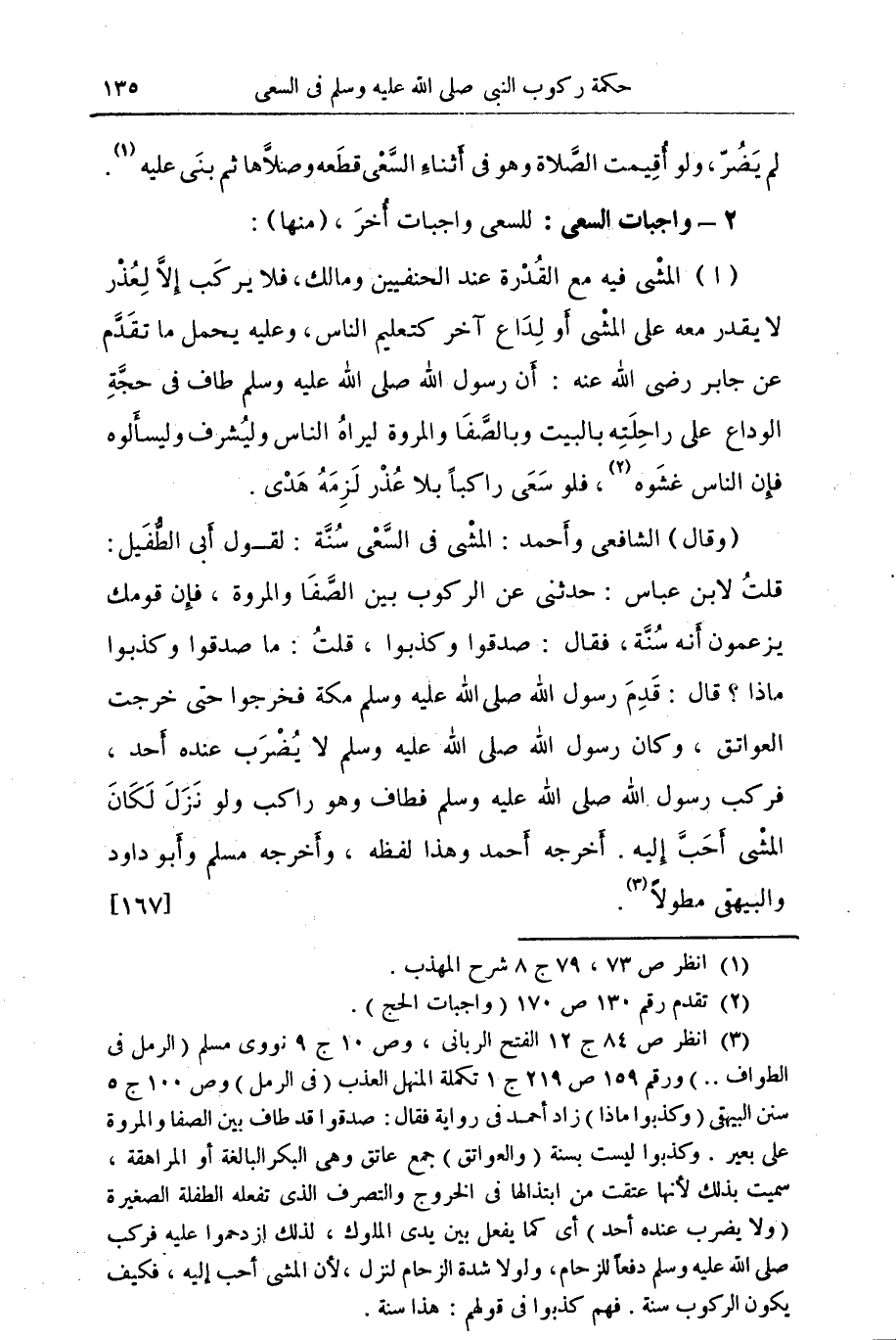 (وقال) الشافعي وأحمد: المشي في السعي سنة: لقول أبي الطفيل: قلت لابن عباس: حدثني عن الركوب بين الصفا والمروة , فأن قومك يزعمون أنه سنة. فقال: صدقوا وكذبوا. قلت: ما صدقوا وكذبوا ماذا؟ قال: قدم رسول الله صلى الله عليه وسلم مكة فخرجوا حتى خرجت العواتق. وكان رسول الله صلى الله عليه وسلم فطاف وهو راكب ولو نزل لكان المشى أحب إليه. أخرجه أحمد وهذا لفظه. وأخرجه مسلم وأبو داود والبيهقي مطولا (¬3). {167}