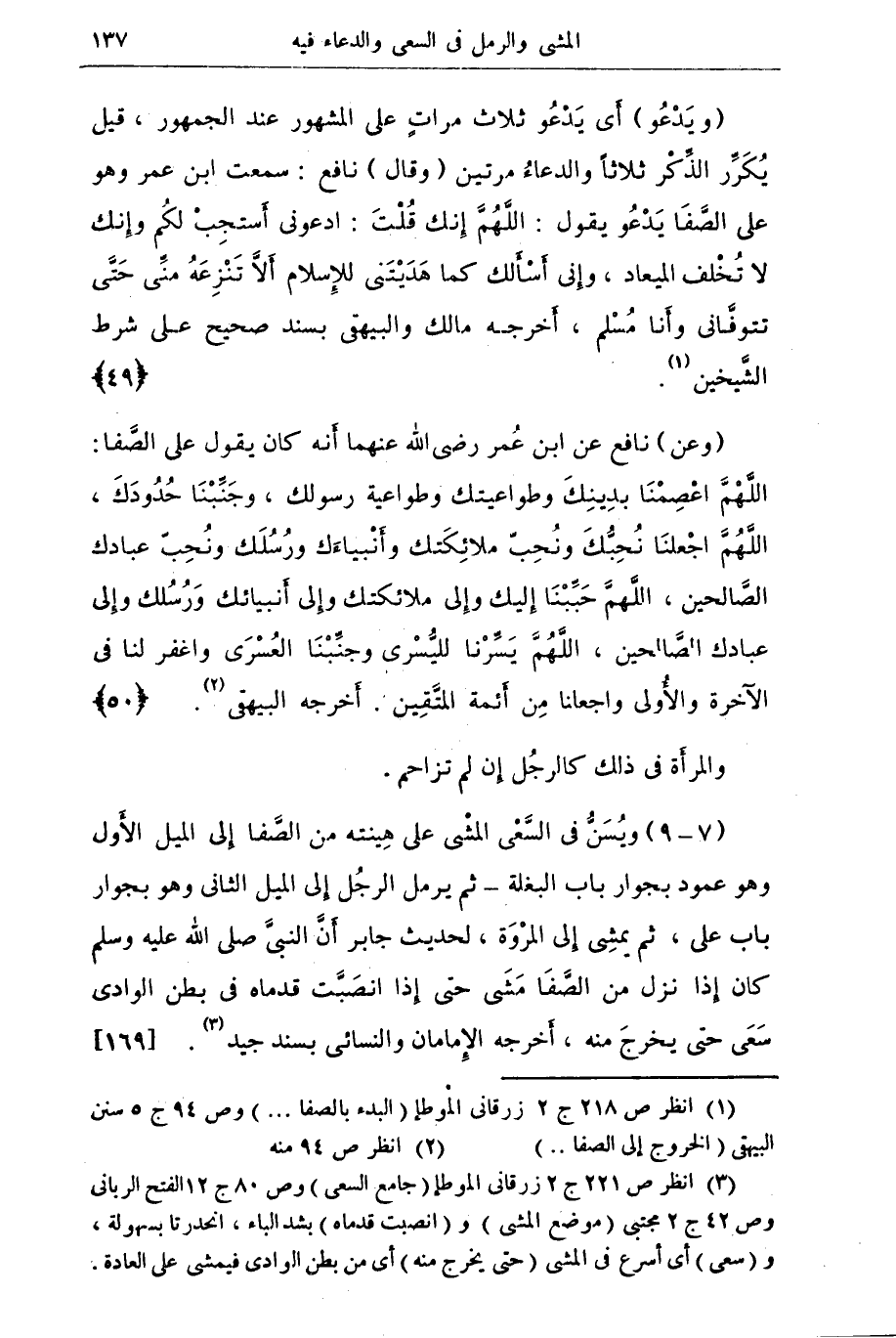 (7 - 9) ويسن في السعي المشي على هينته من الصفا إلى الميل الأول - وهو عمود بجوار باب البغلة - ثم يرمل الرجل إلى الميل الثاني وهو بجوار باب على. ثم يمشي إلى المروة , لحديث جابر أن النبي صلى الله عليه وسلم كان إذا نزل من الصفا مشى حتى ذا أنصبت قدماه في بطن الوادي سعى حتى يخرج منه. أخرجه الإمامان والنسائي بسند جيد (¬3) {169}