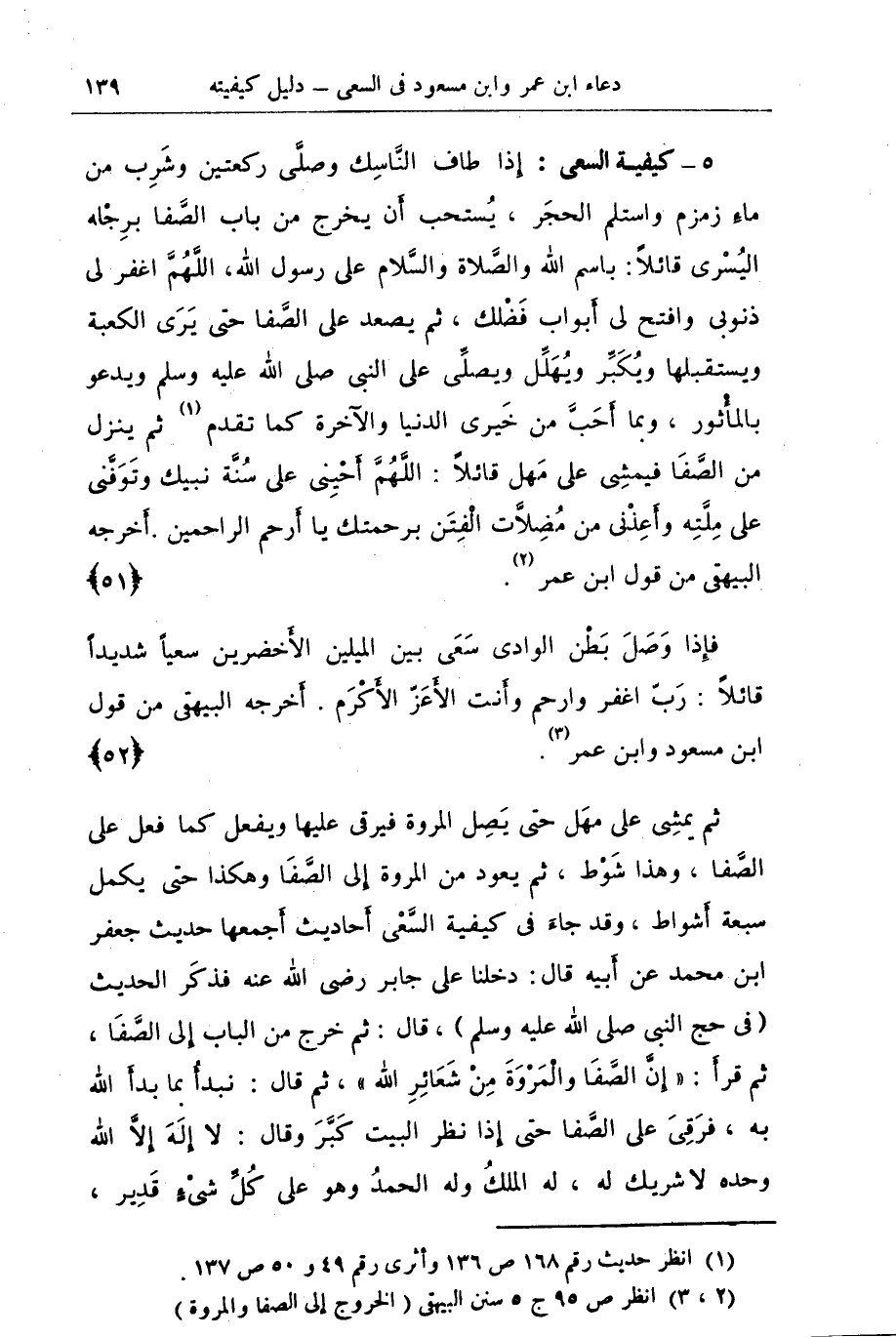 (5) كيفية السعي - إذا طاف الناسك وصلى ركعتين وشرب من ماء زمزم واستلم الحجر , يستحب أن يخرج من باب الصفا برجله اليسرى قائلا: باسم الله والصلاة والسلام على رسول الله اللهم اغفر لي ذنوبي وافتح لي أبواب فضلك , ثم يصعد على الصفا حتى يرى الكعبة ويستقبلها ويكبر ويهلل ويصلى على النبي صلى الله عليه وسلم ويدعو بالمأثور , وبما احب من خيري الدنيا والآخرة كما تقدم (¬1) ثم ينزل من الصفا فيمشي على مهل قائلا: اللهم أحيني على سنة نبيك وتوفني على ملته وأعذني من مضلات الفتن برحمتك يا أرحم الراحمين. أخرجه البيهقي من قول ابن عمر (¬2). {51}