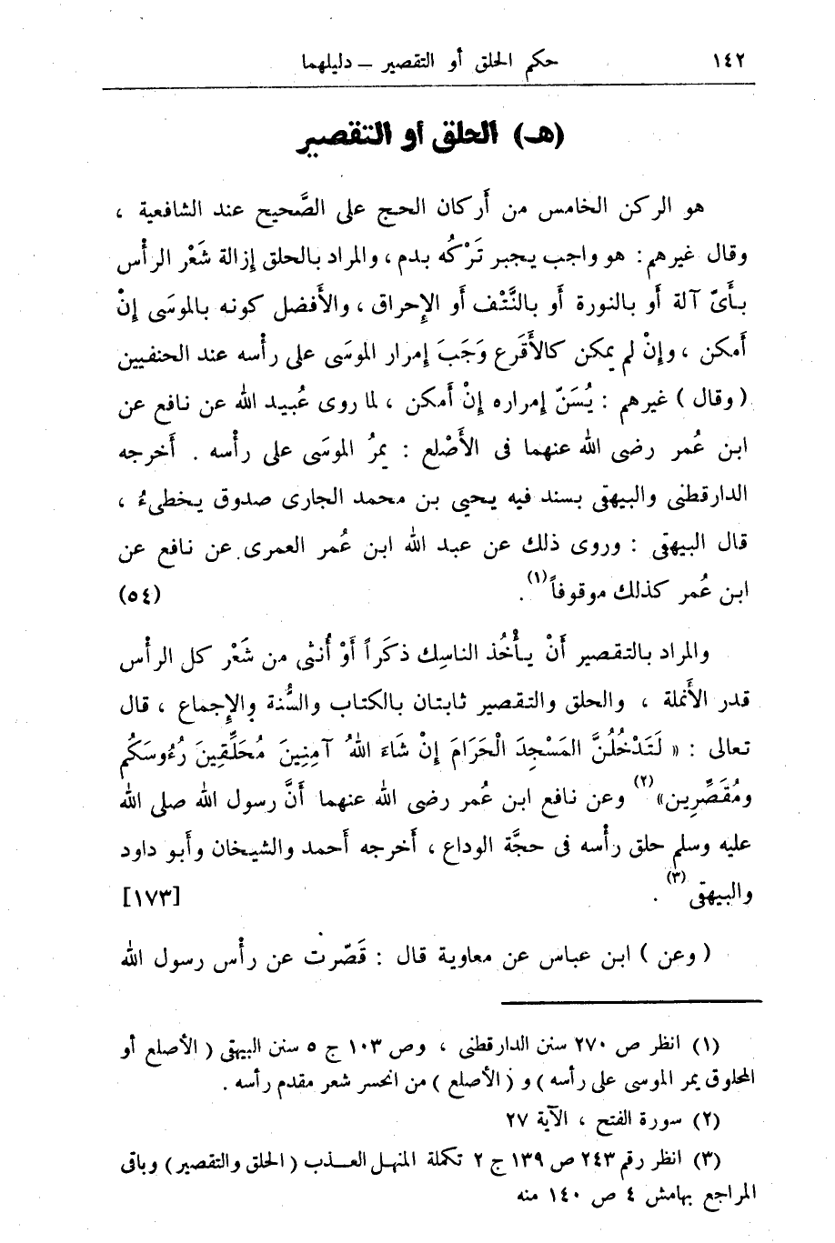 (¬1) ص 270 سنن الدارقطني. وص 103 ج 5 سنن البيهقي (الأصلع أو المحلوق يمر الموسى على رأسه) و (الأصلع) من انحسر شعر مقدم رأسه.
