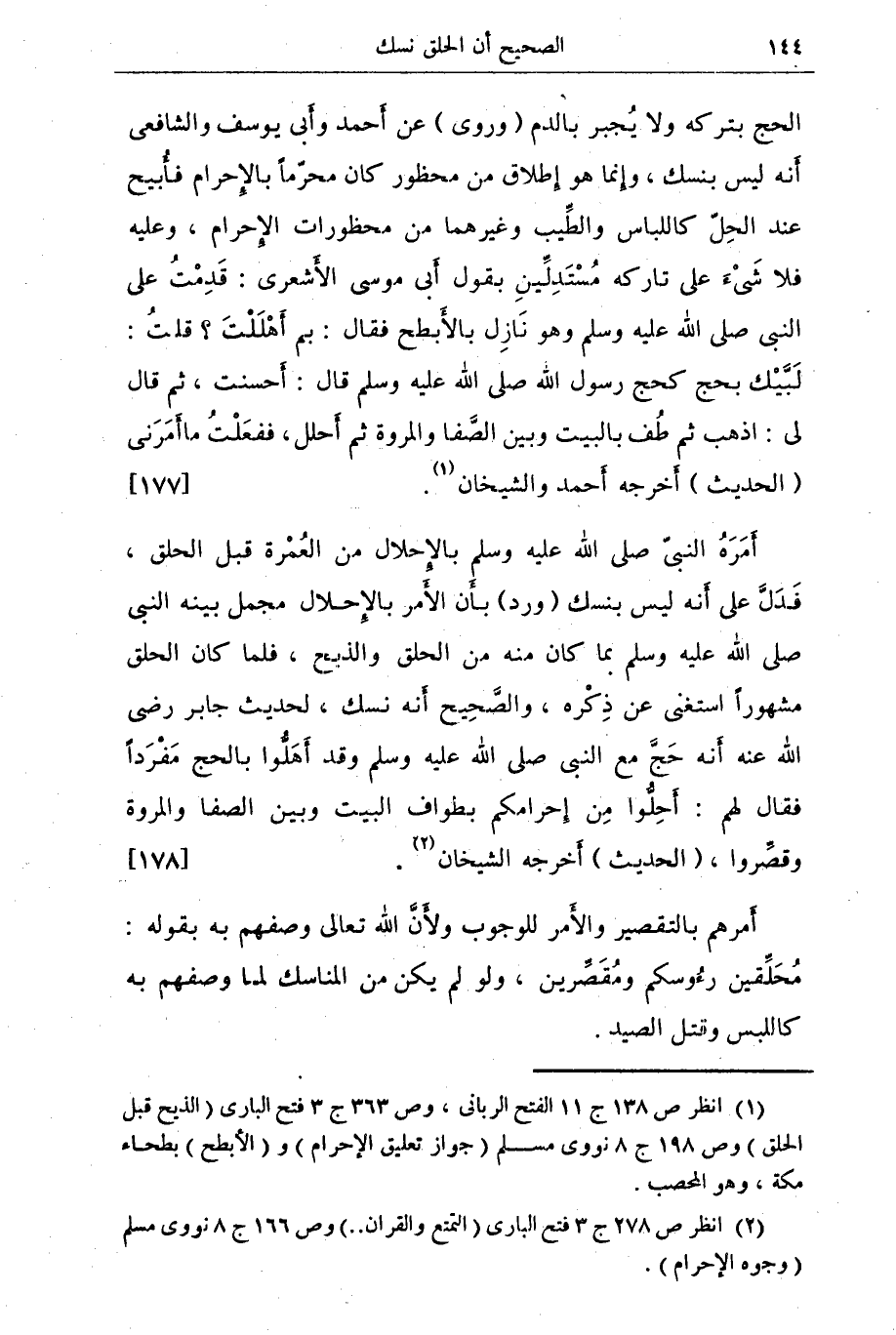 أمره النبي صلى الله عليه وسلم بالإحلال من العمرة قبل الحلق فدل على أنه ليس بنسك (ورد) بأن الأمر بالإحلال مجمل بينه النبي صلى الله عليه وسلم بما كان منه من الحلق والذبح. فلما كان الحلق مشهوراً استغنى عن ذكره. والصحيح أنه نسك , لحديث جابر رضي الله عنه أنه حج مع النبي صلى الله عليه وسلم وقد أهلوا بالحج مفرداً فقال لهم: أحلوا من إحرامكم بطواف البيت وبين الصفا والمروة وقصروا. (الحديث) أخرجه الشيخان (¬2) {178}