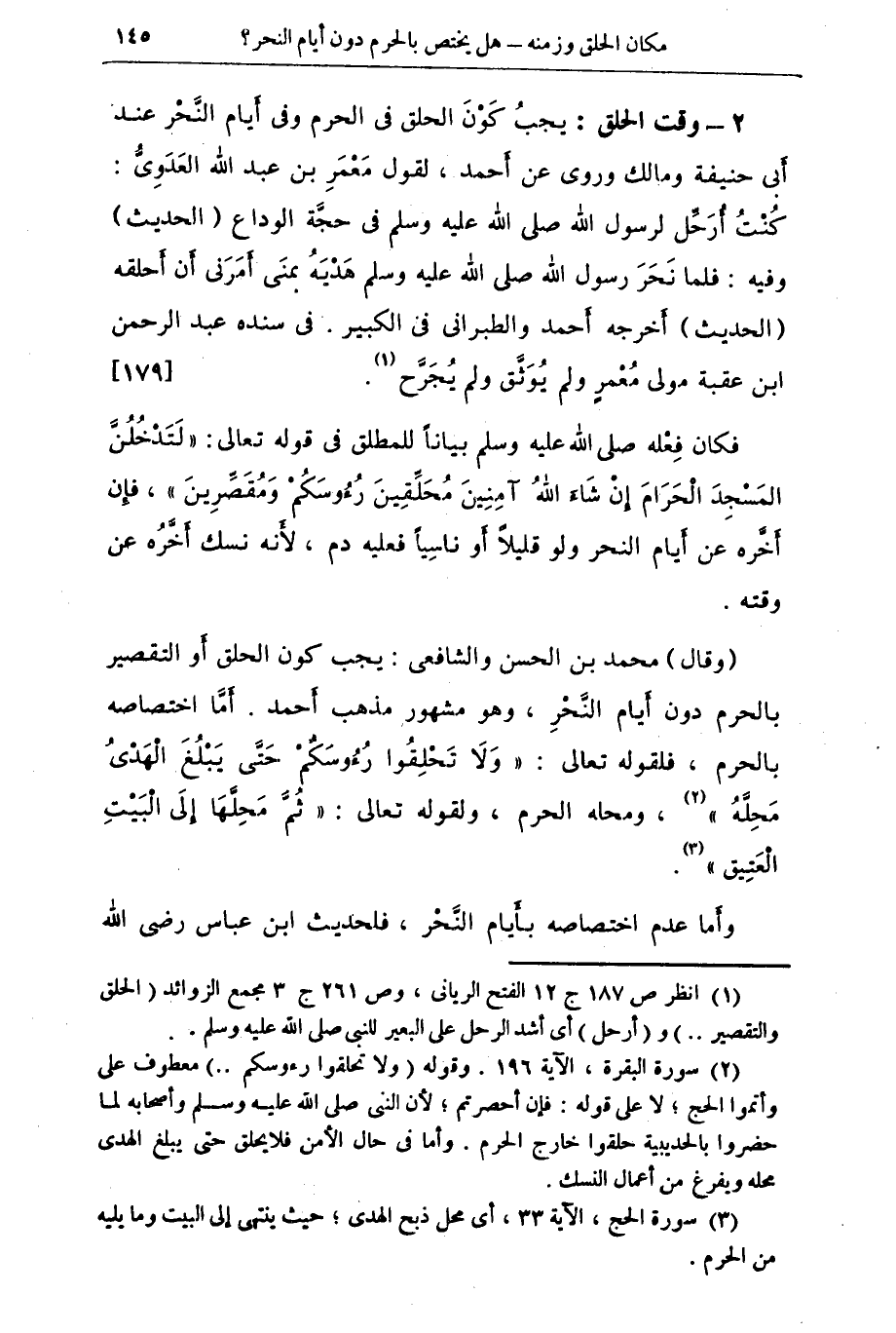 (2) وقت الحلق - يجب كون الحلق في الحرم وفي أيام النحر عند أبي حنيفة ومالك وروى عن احمد , لقول معمر بن عبد الله العدوى: كنت أرحل لرسول الله صلى الله عليه وسلم في حجة الوداع (الحديث) وفيه: فلما نحر رسول الله صلى الله عليه وسلم هديه بمنى أمرني أن أحلقه (الحديث) أخرجه أحمد والطبراني في الكبير. وفي سنده عبد الرحمن بن عقبة مولى معمر ولم يوثق ولم يجرح (¬1) {179}