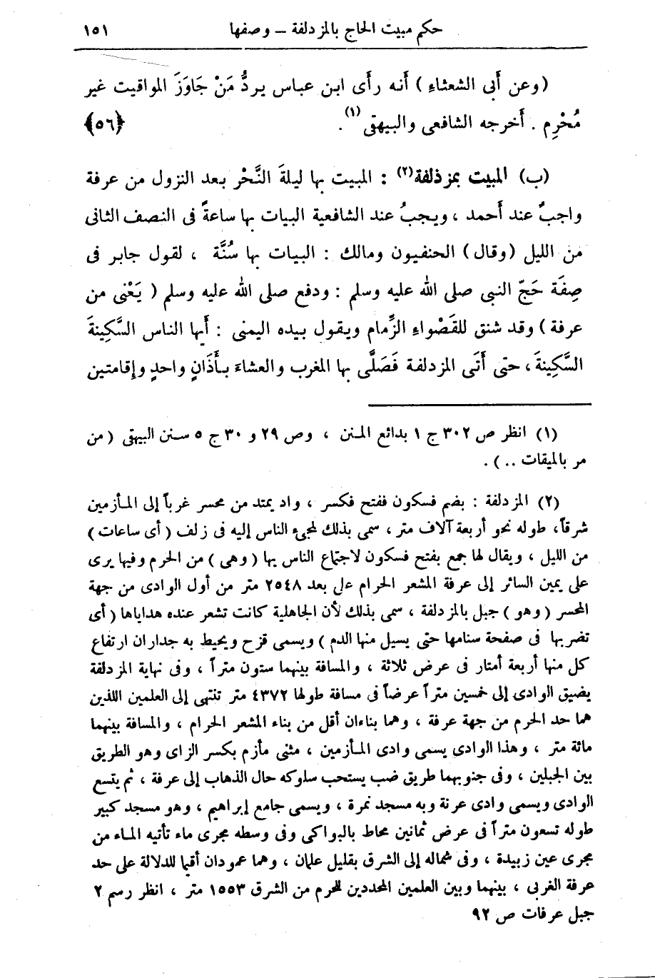 (¬2) المزدلفة: بضم فسكون ففتح فكسر , واد يمتد من غربا إلى المأزمين شرقا. طوله نحو أربعة آلاف متر. سمي بذلك لمجئ الناس إليه في زلف (أي ساعات) من الليل. ويقال لها جمع بفتح فسكون لاجتماع الناس بها (وهي) من الحرم وفيها يرى على يمين السائر إلى عرفة المشعر الحرام على بعد 2548 متر من أول الوادي من جهة المحسر (وهو) جبل بالمزدلفة. سمي بذلك لأن الجاهلية كانت تشعر عنده هداياها (أي تضر بها في صفحة سنامها حتى يسيل منها الدم) ويسمى قزح ويحيط جدران ارتفاع كل منهما أربعة أمتار في عرض ثلاثة. والمسافة بينهما ستون متراً وفي نهاية المزدلفة يضيق الوادي إلى خمسين متراً عرضاً في مسافة طولها 4372 متر تنتهي إلى الميلين اللذين هما حد الحرم من جهة عرفة. وهما بناءان أقل من بناء المشعر الحرام. والمسافة بينهما مائة متر. وهذا الوادي يسمى وادي المأزمين. مثنى مازم بكسر الزاي وهو الطريق بين الجبلين. وفي جنوبهما طريق ضب يستحب سلوكه حال الذهاب إلى عرفة. ثم يتسع الوادي ويسمى وادي عرنة وبه مسجد نمرة. ويسمي جامع إبراهيم. وهو مسجد كبير طوله تسعون متراً في عرض ثمانين محاطا بالبواكي وفي وسطه مجرى ماء يأتيه الماء من مجرى عين زبيدة. وفي شماله إلى الشرق بقليل علمان. وهما عمودان أقيما للدلالة على حد عرفة الغربي. بينهما وبين العلمين المحددين للحرم من الشرق 1553 متر. انظر رسم 2 جبل عرفات ص 92.