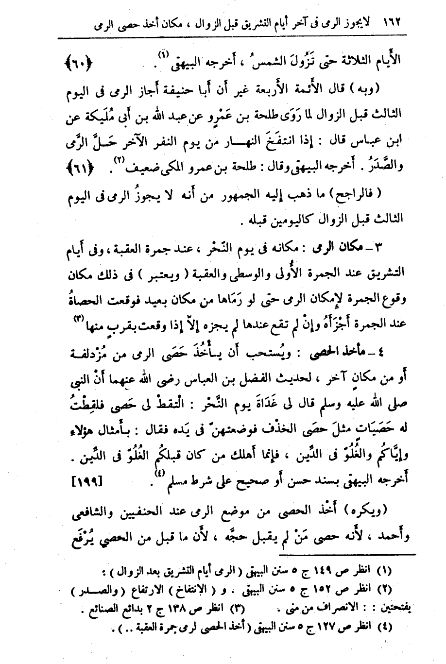(4) مأخذ الحصى - ويستحي أن يأخذ حصى الرمي من مزدلفة أو من مكان آخر , لحديث الفضل بين العباس رضي الله عنهما أن النبي صلى الله عليه وسلم غداة يوم النحر: التقط لي حصى فلقطت له حصيات مثل حصى الخذف فوضعتهن في يده فقال: بأمثال هؤلاء وإياكم والغلو في الدين , فإنما أهلك من كان قبلكم الغلو في الدين. أخرجه البيهقي بسند حسن أو صحيح على شرط مسلم (¬4) {199}