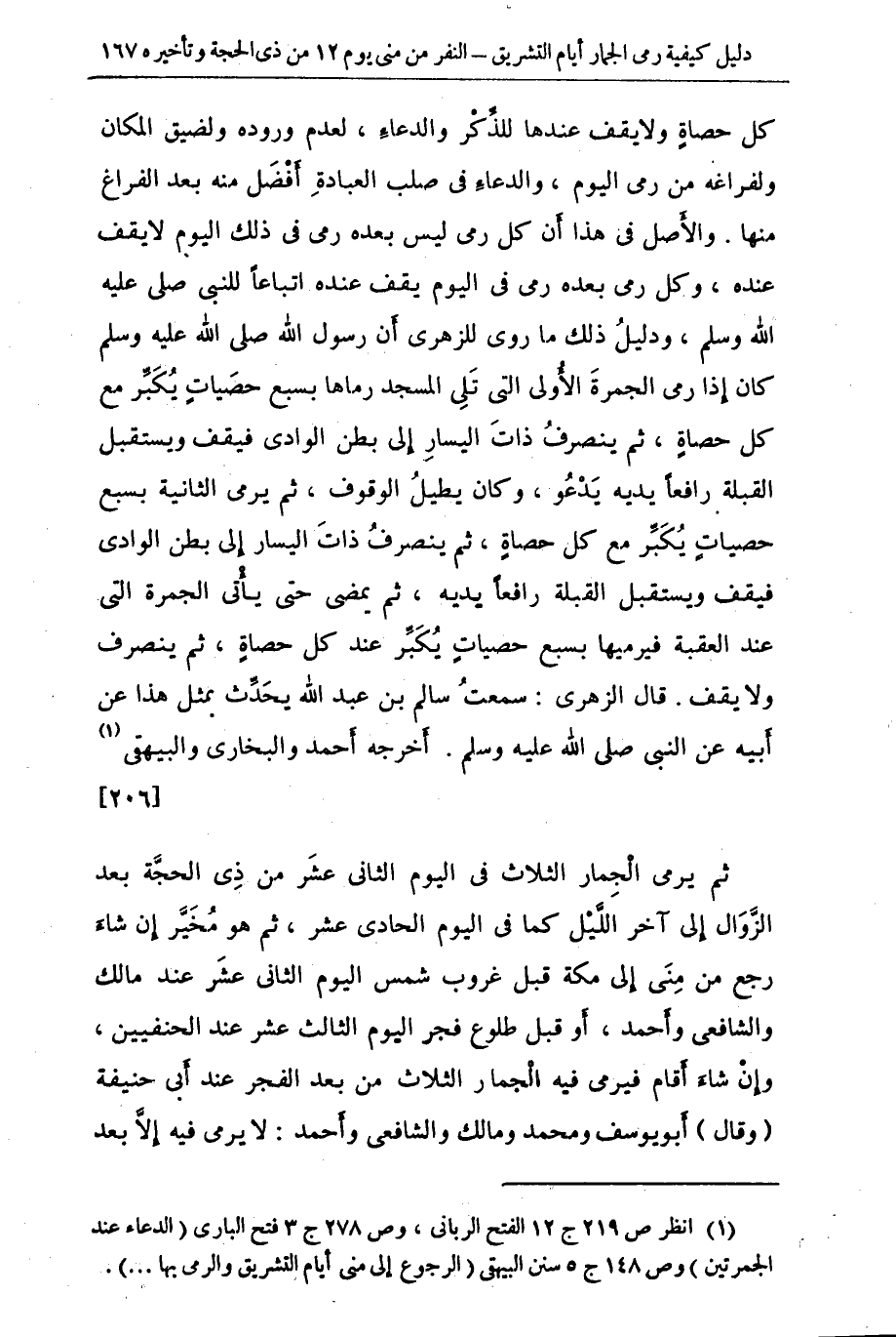 (¬1) ص 219 ج 12 - الفتح الرباني. وص 278 ج 3 فتح الباري (الدعاء عند الجمرتين) وص 148 ج 5 سنن البيهقي (الرجوع إلى منى أيام التشريق والرمي بها ... ).