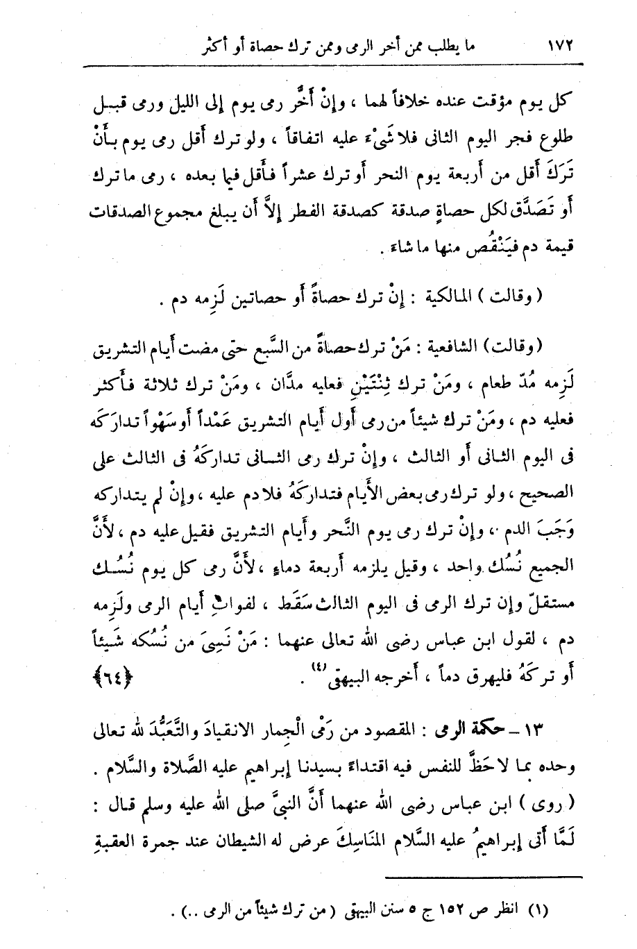 (13) حكمة الرمي ـ المقصود من رمي الجمار الانقياد والتعبد لله تعالى وحده بما لا حظ للنفس فيه اقتداء بسيدنا إبراهيم عليه الصلاة والسلام. «روي» ابن عباس رضى الله عنهما أن النبي صلى الله عليه وسلم قال: لما أتى إبراهيم عليه السلام المناسك عرض له الشيطان عند جمره العقبة