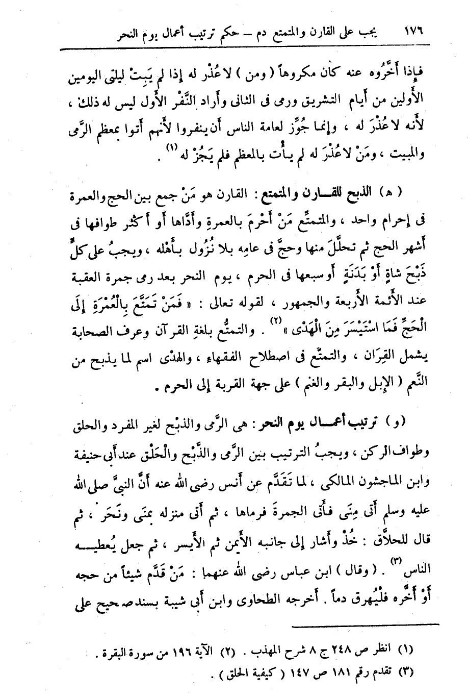 (هـ) الذبح للقارن والمتمتع - القارن هو من جمع بين الحج والعمرة في إحرام واحد. والمتمتع من أحرم بالعمرة وأداها أو أكثر طوافها في أشهر الحج ثم تحلل منها وحج في عامة بلا نزول بأهله. ويجب على كل ذبح شاة أو بدنة أو سبعها في الحرم يوم النحر بعد رمي جمرة العقبة عند الأئمة الأربعة والجمهور , لقوله تعالى «فمن تمتع بالعمرة إلى الحج فما استير من الهدى» (¬2) والتمتع بلغة القرآن وعرف الصحابة يشمل القران والتمتع في اصطلاح الفقهاء. والهدى اسم لما يذبح من النعم (الإبل والبقر والغنم) على جهة القربة إلى الحرم.
