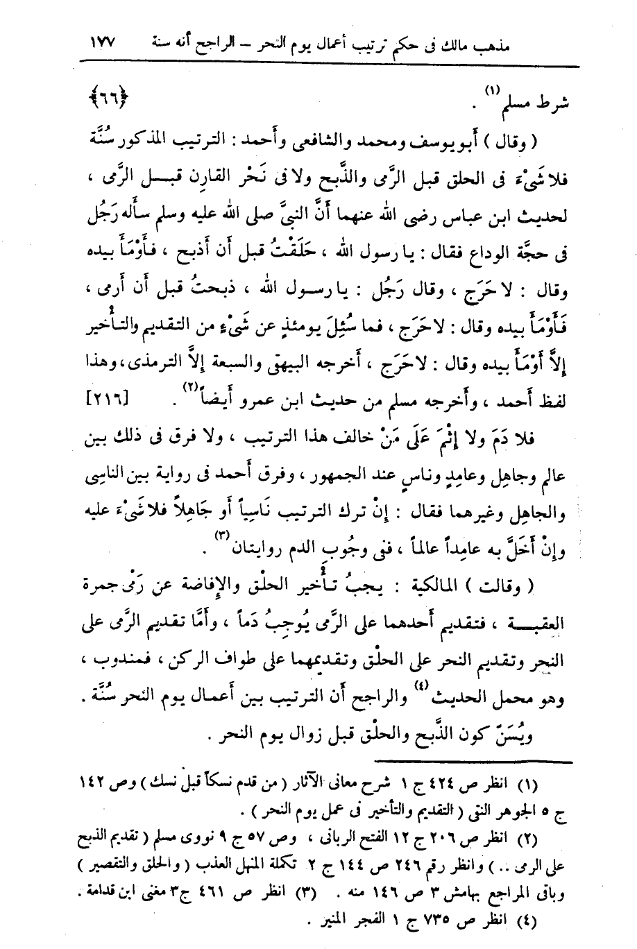 (¬2) ص 206 ج 12 - الفتح الرباني. وص 57 ج 9 نووي مسلم (تقديم الذبح على الرمي ... ) وانظر رقم 246 ج 2 تكملة المنهل العذب (والحلق والتقصير) وباقي المراجع بهامش 3 ص 146 منه.