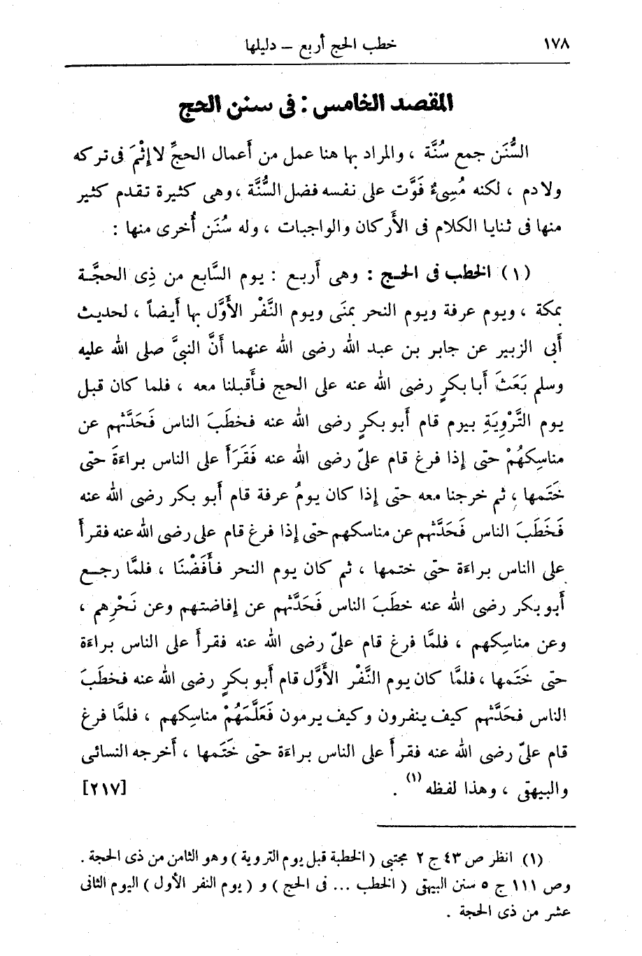 (¬1) ص 43 ج 2 مجتبي (الخطبة قبل يوم التروية) وهو الثامن من ذي الحجة. وص 111 ج 5 سنن البيهقي (الخطب ... في الحج) و (يوم النفر الأول) اليوم الثاني عشر من ذي الحجة.