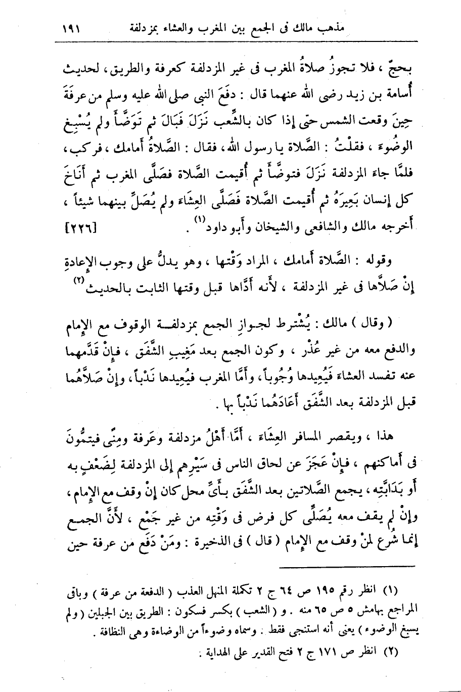 (¬1) انظر رقم 195 ص 64 ج 2 تكملة المنهل العذب (الدفعة من عرفة) وباقي المراجع بهامش 5 ص 65 منه. و (الشعب) بكسر فسكون الطريق بين الجبلين (ولم يسبغ الوضوء) يعني أنه استنجى فقط. وسماه وضوءا من الوضاءة وهي النظافة.