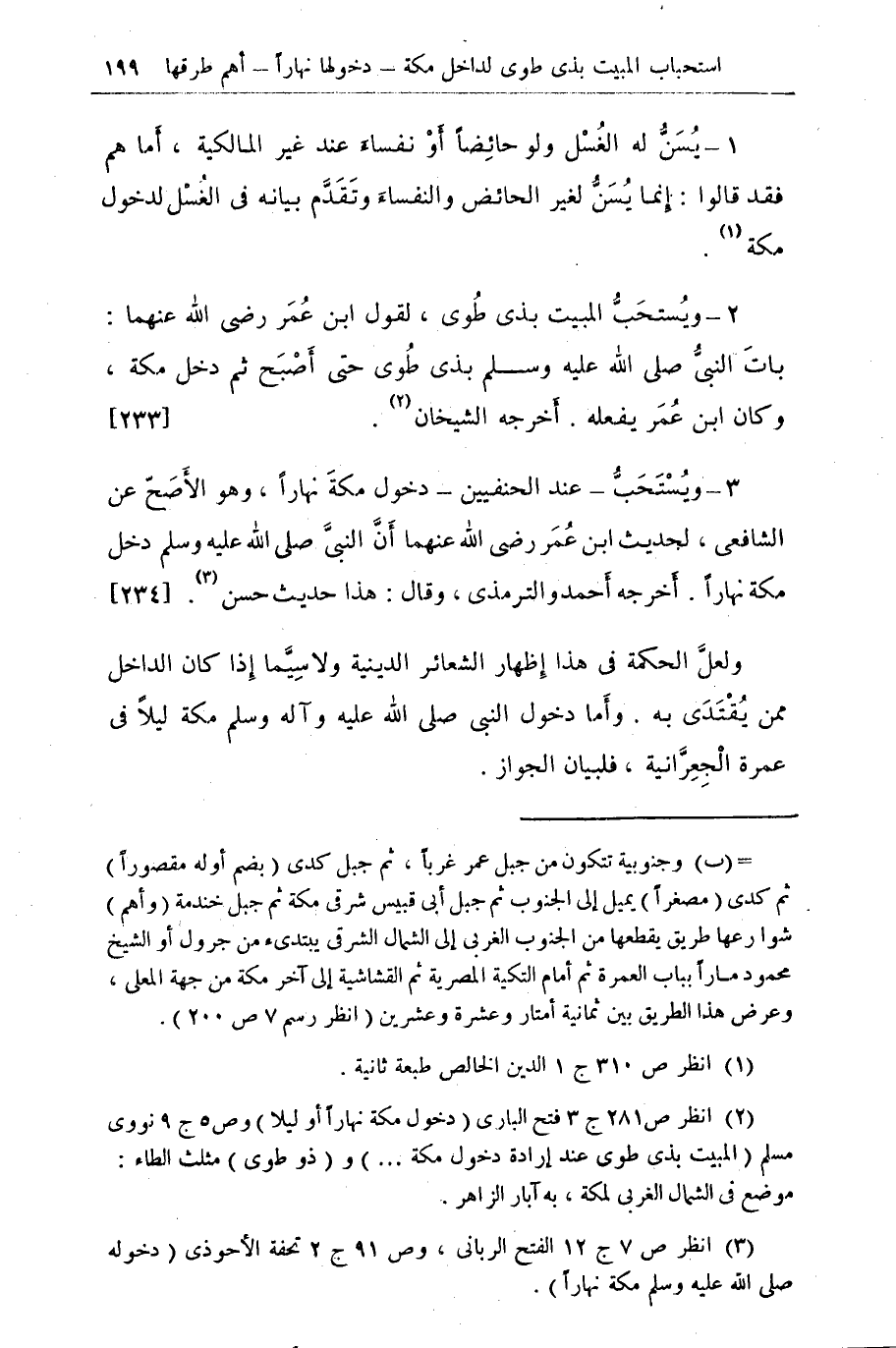 (¬2) ص 281 ج 3 فتح الباري (دخول مكة نهاراً أو ليلاً) وص 5 ج 9 نووي مسلم (المبيت بذي طوى عند إرادة دخول مكة ... ) و (ذو طوى) مثلث الطاء , موضع في الشمال الغربي لمكة. به آبار الزاهر.