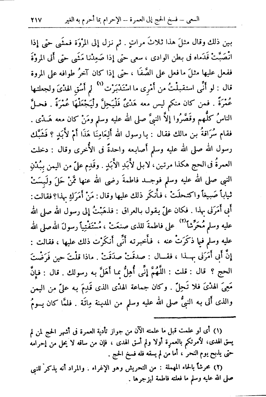 ثم نزل إلى المروة فمشى حتى إذا انصبت قدماه فى بطن الوادى , سعى حتى إذا صعدنا مشى حتى أتى المروة ففعل عليها مثل ما فعل على الصفا , حتى إذا كان آخر طوافه على المروة قال: لو أتى استقبلت من أمرى ما استدبرت (¬1) لم أسبق الهدى ولجعلتها عمرة. فمن كان منكم ليس معه هدى فليجعل وليجعلها عمرة. فحل الناس كلهم وقصروا إلا النبى صلى الله عليه وسلم ومن كان معه هدى. فقام سراقة ابن مالك فقال: يا رسول الله ألعامنا هذا أم لأبد؟ فشبك رسول الله صلى الله عليه وسلم أصابعه واحدة فى الأخرى وقال: دخلت العمرة فى الحج هكذا مرتين , لا بل لأبد أبد. وقدم على من اليمن ببدن النبى صلى الله عليه وسلم فوجد فاطمة رضى الله عنها ممن حل ولبست ثيابا صبيغا واكتحلت فأنكر ذلك عليها وقال: من أمرك بهذا؟ فقالت: أبى أمرنى بهذا. فكان على يقول بالعراق: فذهبت إلى رسول الله صلى الله عليه وسلم محرشا * على فاطمة للذى صنعت مستفتيا رسول الله صلى الله عليه وسلم فيما ذكرت عنه فأخبرته أنكرت ذلك عليها فقالت: إن أبى أمرنى بهذا فقال: صدقت صدقت. ماذا قلت حين فرضت الحج؟ قال: قلت اللهم إنى أهل بما أهل به رسولك. قال: فإن معى الهدى فلا تحل. وكان جماعة الهدى الذى قدم به على من اليمن والذى أتى النبى صلى الله عليه وسلم من المدينة مائة. فلما كان يوم