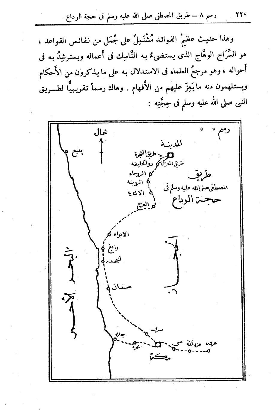 وهذا حديث عظيم الفوائد مشتمل على جمل من نفائس القواعد. هو السراج الوهاج الذي يستضئ به الناسك في أعماله ويسترشد به في أحواله. وهو مرجع العلماء في الاستدلال به على ما يذكرون من الأحكام ويستلهمون منه ما يعز عليهم من الأفهام. وهاك رسما تقريبيا لطريق النبي صلى الله عليه وسلم في حجته.
