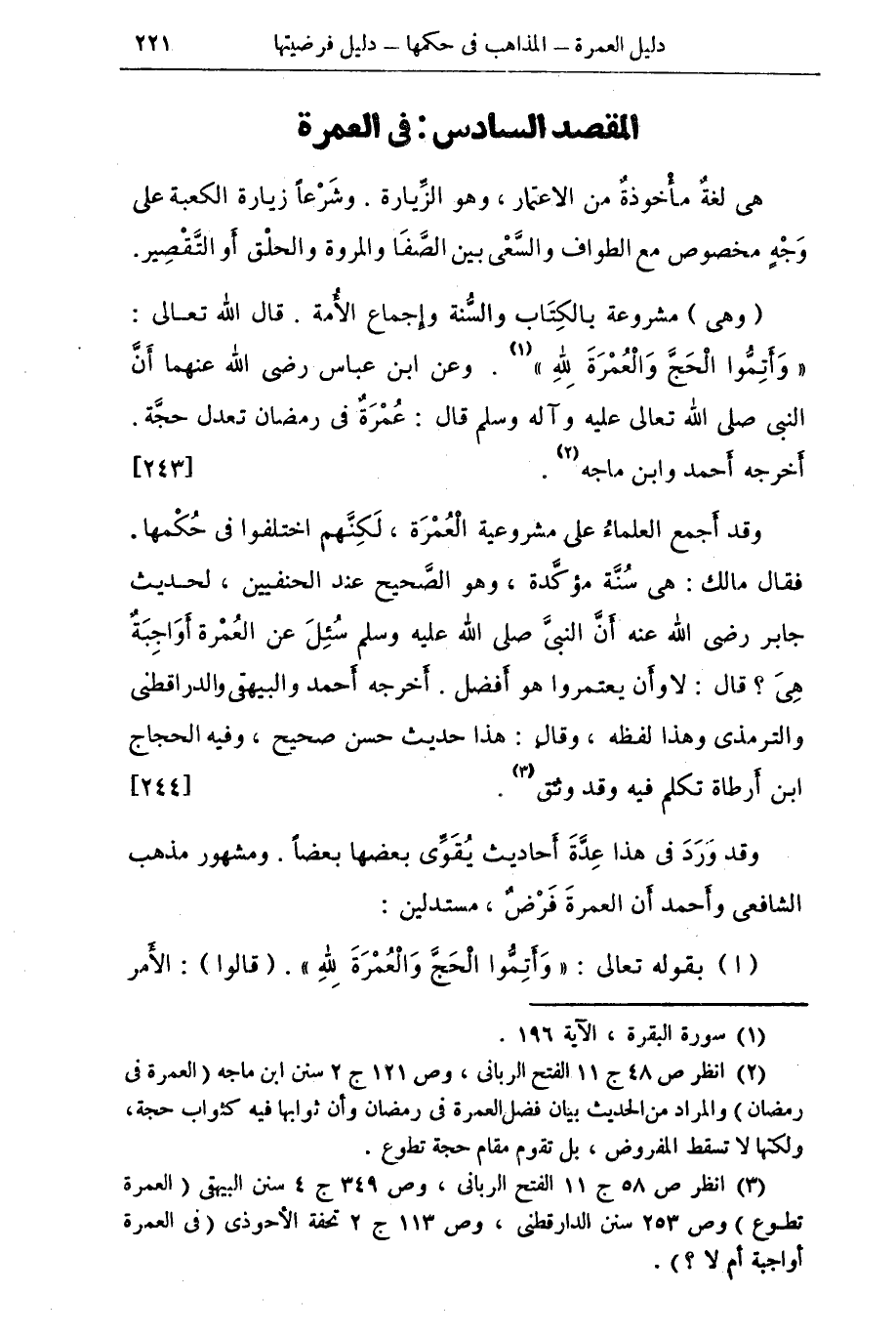 وقد أجمع العلماء على مشروعية العمرة لكنهم اختلفوا في حكمها. فقال مالك: هي سنة مؤكدة وهو الصحيح عند الحنفيين , لحديث جابر رضي الله عنه أن النبي صلى الله عليه وسلم سئل عن العمرة أوااجبه هي؟ قال: لا وأن يعتمروا هو أفضل. أخرجه أحمد والبيهقي والدارقطني والترمذي وهذا لفظه , وقال: هذا حديث حسن صحيح , وفيه الحجاج بن أرطاة تكلم فيه وقد وثق (¬3) {244}