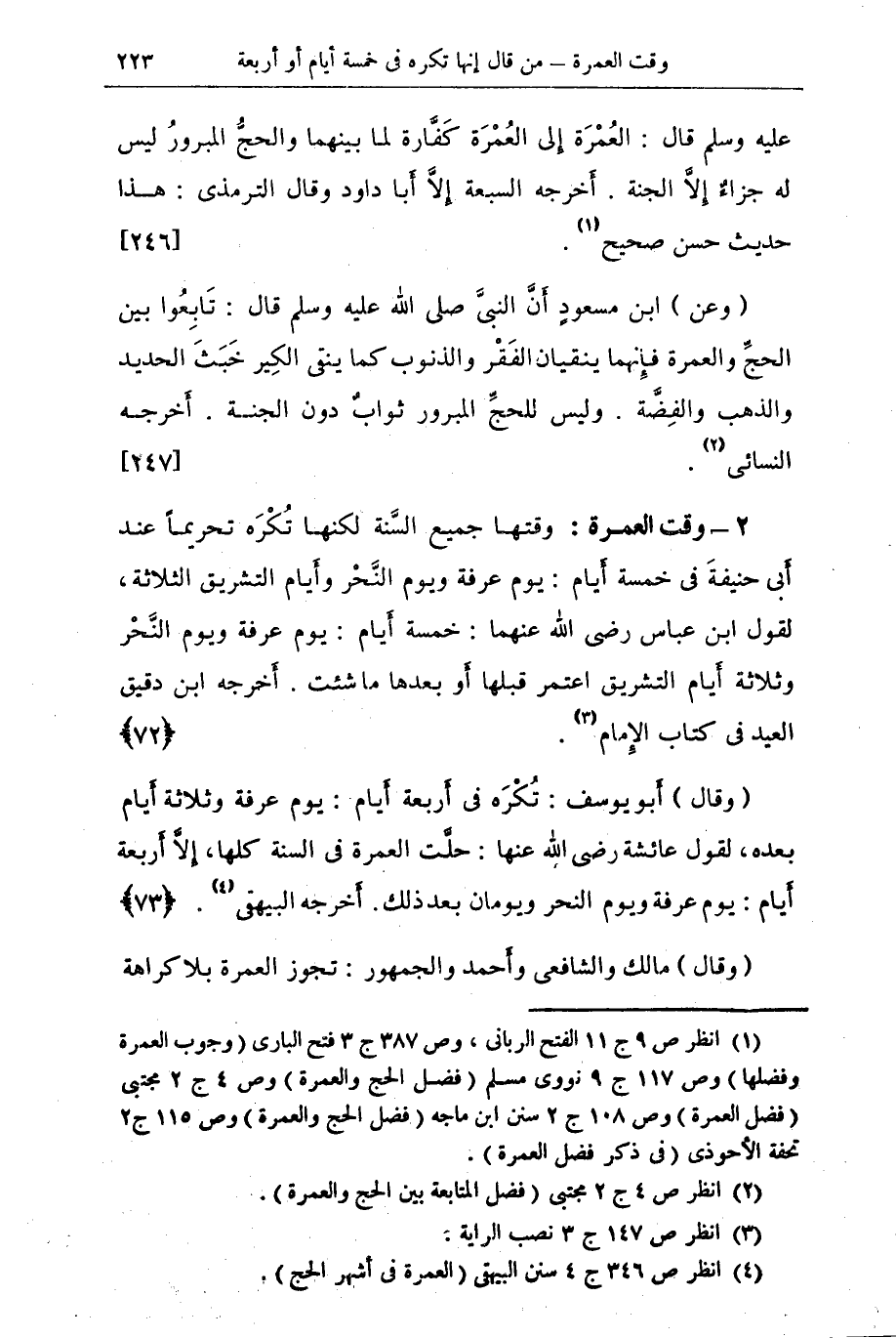 (2) وقت العمرة: وقتها جميع السنة لكنها تكره تحريما عند أبى حنيفة فى خمسة أيام: يوم عرفة ويوم النحر وأيام التشريق الثلاثة , لقول ابن عباس رضى الله عنهما: خمسة أيام يوم عرفة ويوم النحر وثلاثة أيام التشريق اعتمر قبلها أو بعدها ما شئت. أخرجه ابن دقيق العيد في كتاب الإمام (¬3) {72}